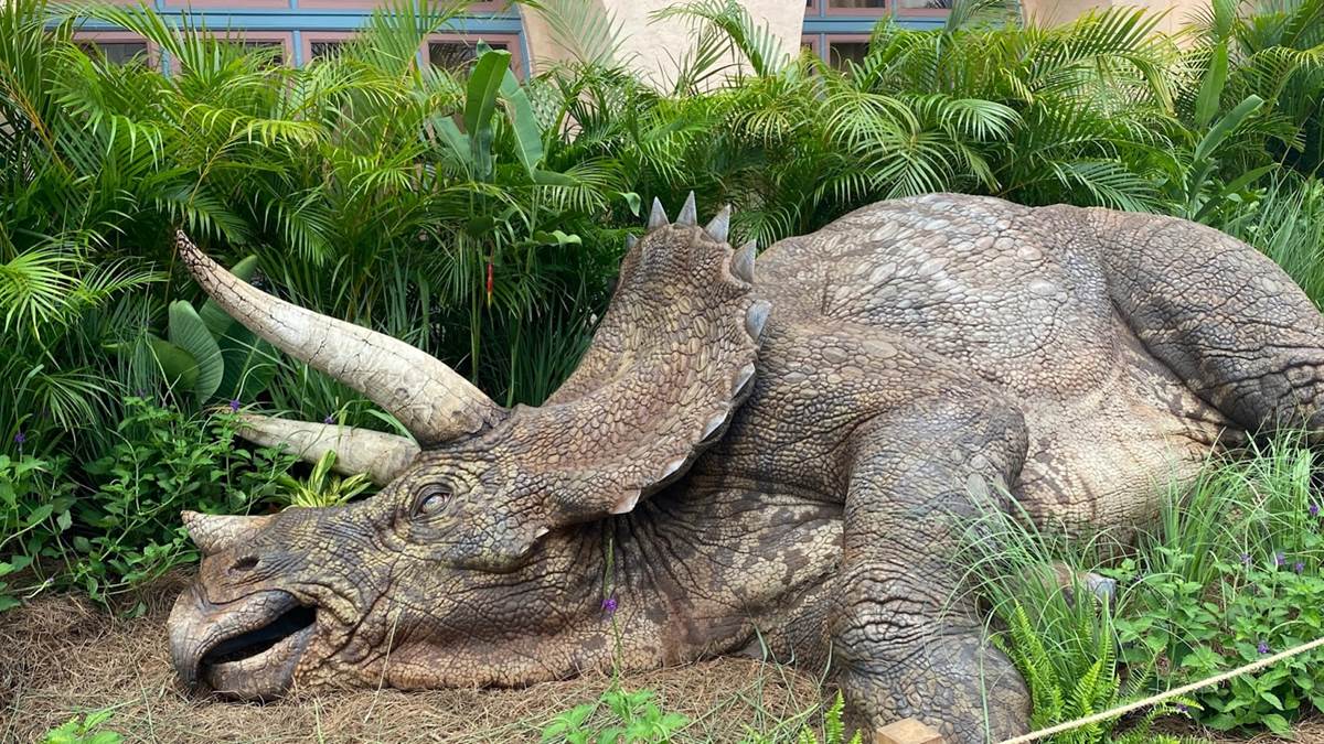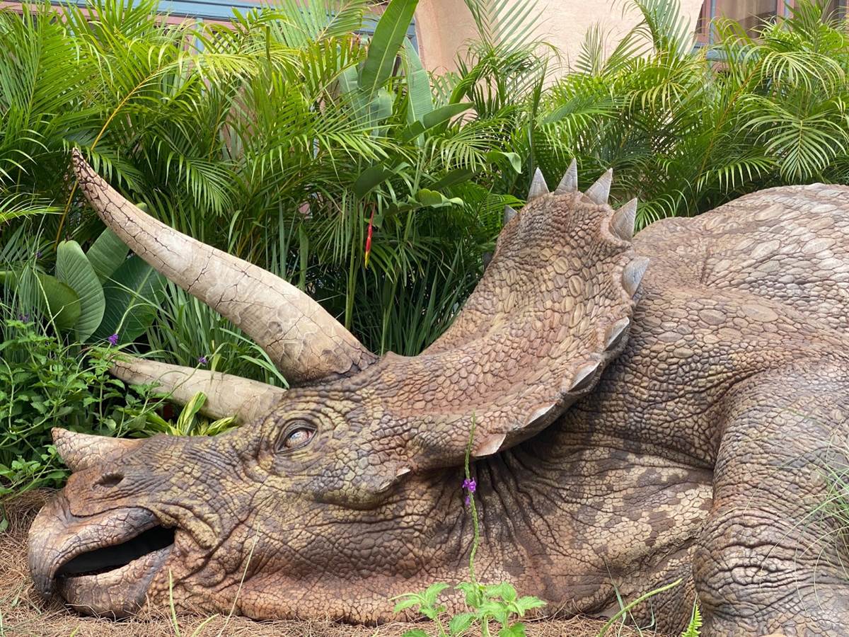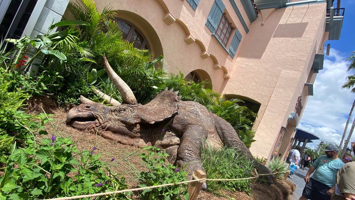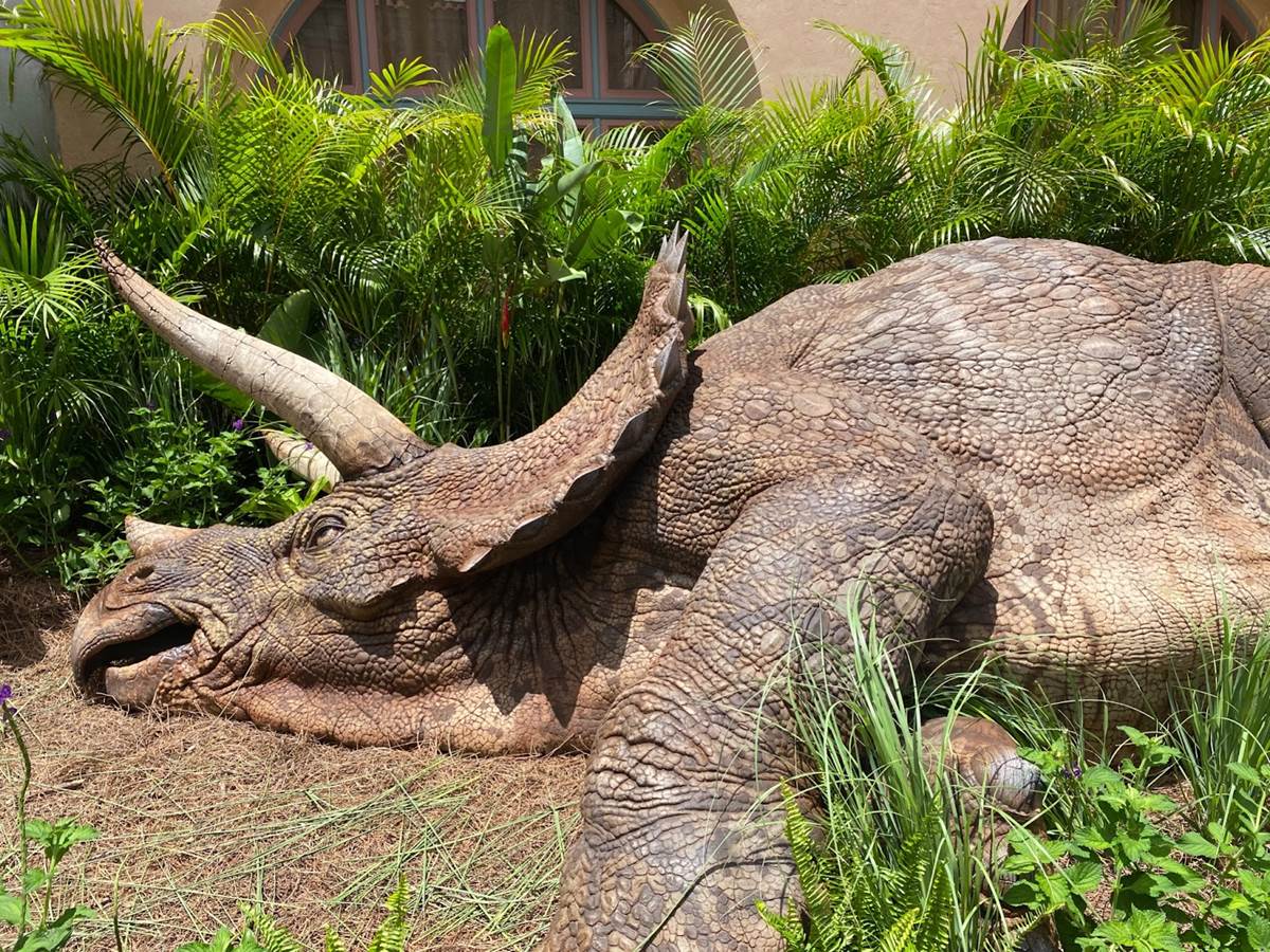 Before fans can even get into the store, they already know something is going on as the store is located in the Hollywood section of the park, and for some reason in Hollywood, there is a sick Triceratops taking up a good portion of the city street. Perhaps West Indian Lilac is native to fake-California in Florida…we’re not sure. The sick Triceratops prop out front makes for a great photo spot (when not surrounded by the queue that is in place to get into the store) and is a great taste of what lies inside for fans.