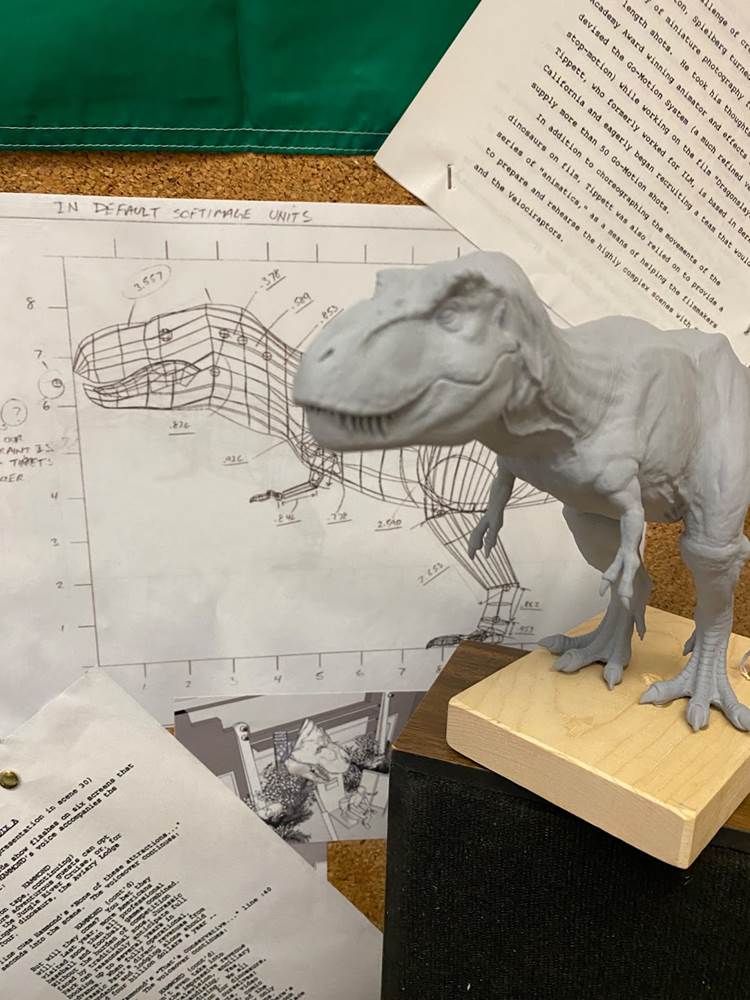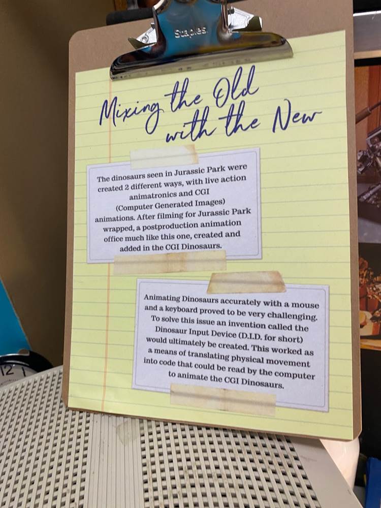 Eagle-eyed fans might notice a reference to Terminator 2: Judgment Day at one of the desk displays, as that film was such a groundbreaking film in computer-generated imagery, it is largely responsible for creating the systems and engines that drove the development and animation of the dinosaurs in Jurassic Park. Phil Tippett, whose studio was going to be responsible for the stop-motion animation in the film developed new rigs (similar to that displayed here) to help with the computer-input for how they would move. More about this reference in the tribute store can be found here.