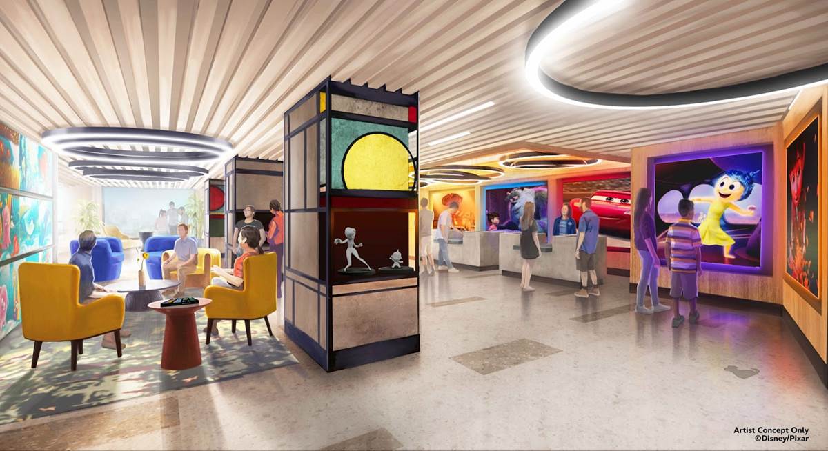 - The lobby (seen above) will continue to evolve over the next few months and will begin to blend beloved Pixar imagery with the hotel’s contemporary setting. When the transformation is complete, iconic images from Pixar films will be at the front desk, with characters pictured larger than life in curated artwork.