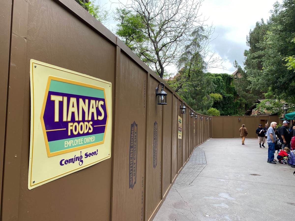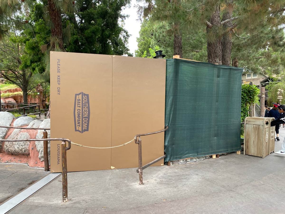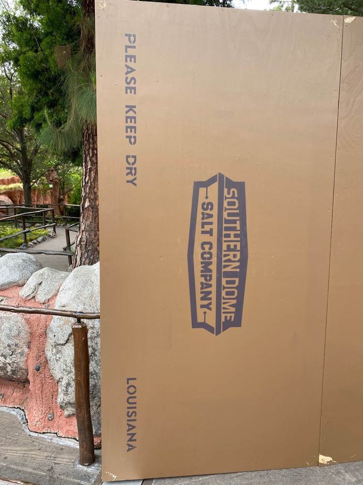 The construction walls start at the end of the bridge into Critter Country. This small set of walls feature a reference to the Southern Dome Salt Company, one of the fictitious companies that will play a part in the new storyline of Tiana’s Bayou Adventure.
