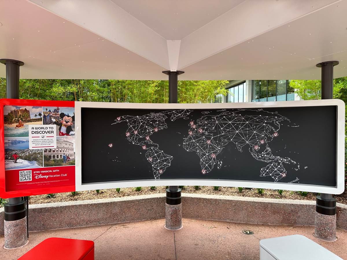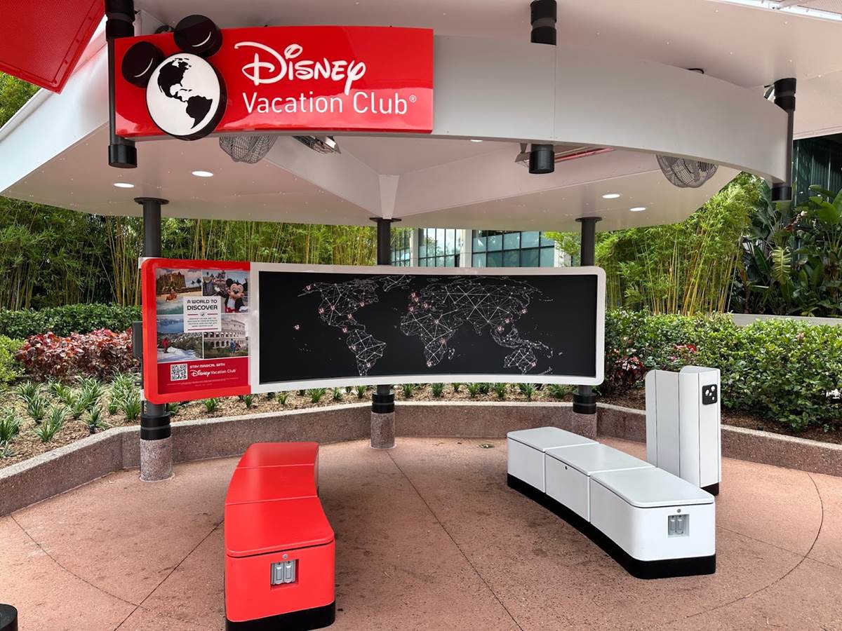 Firstly, the Disney Vacation Club booth located just past Club Cool has been repainted with the World Discovery red and white color scheme. A new map of Disney Vacation Club across the globe has been installed, along with new benches featuring charging ports.