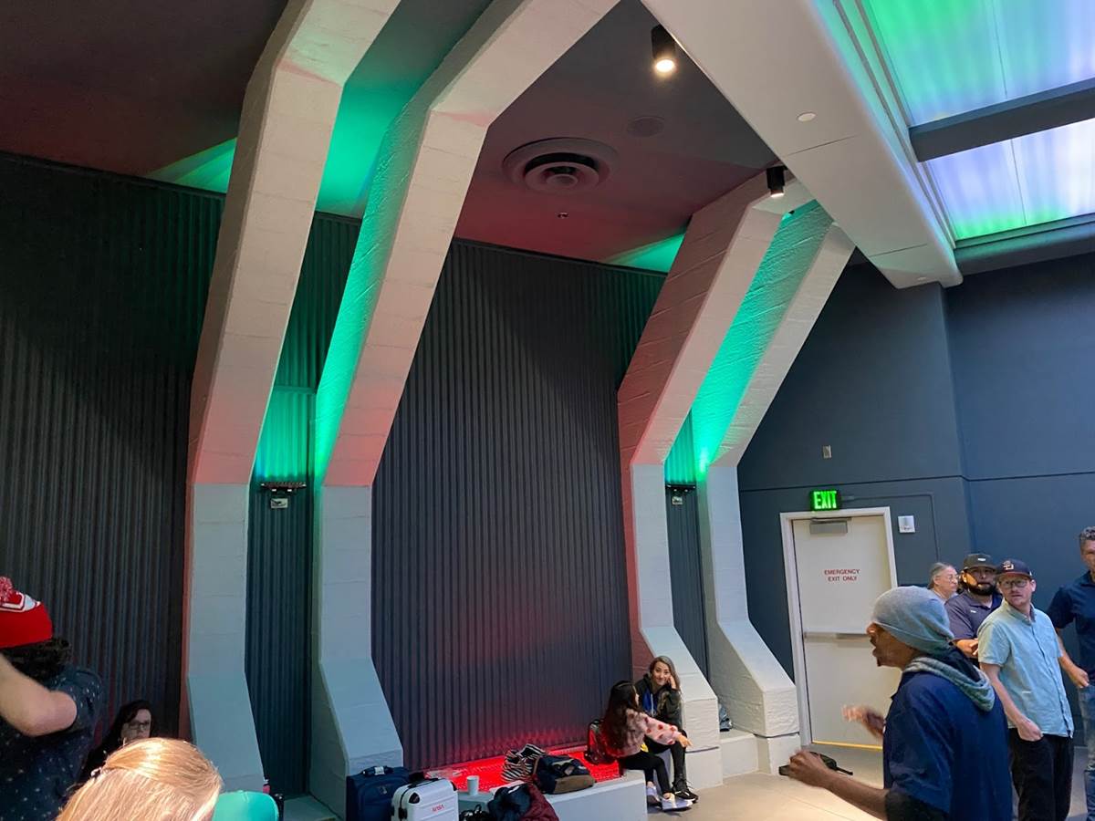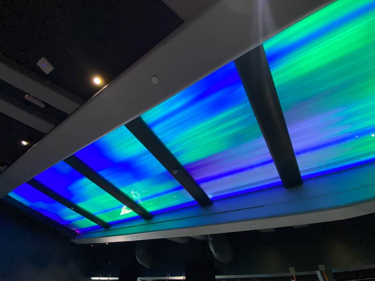 A beautiful light show can be seen above the loading platform, reminiscent of the northern lights.