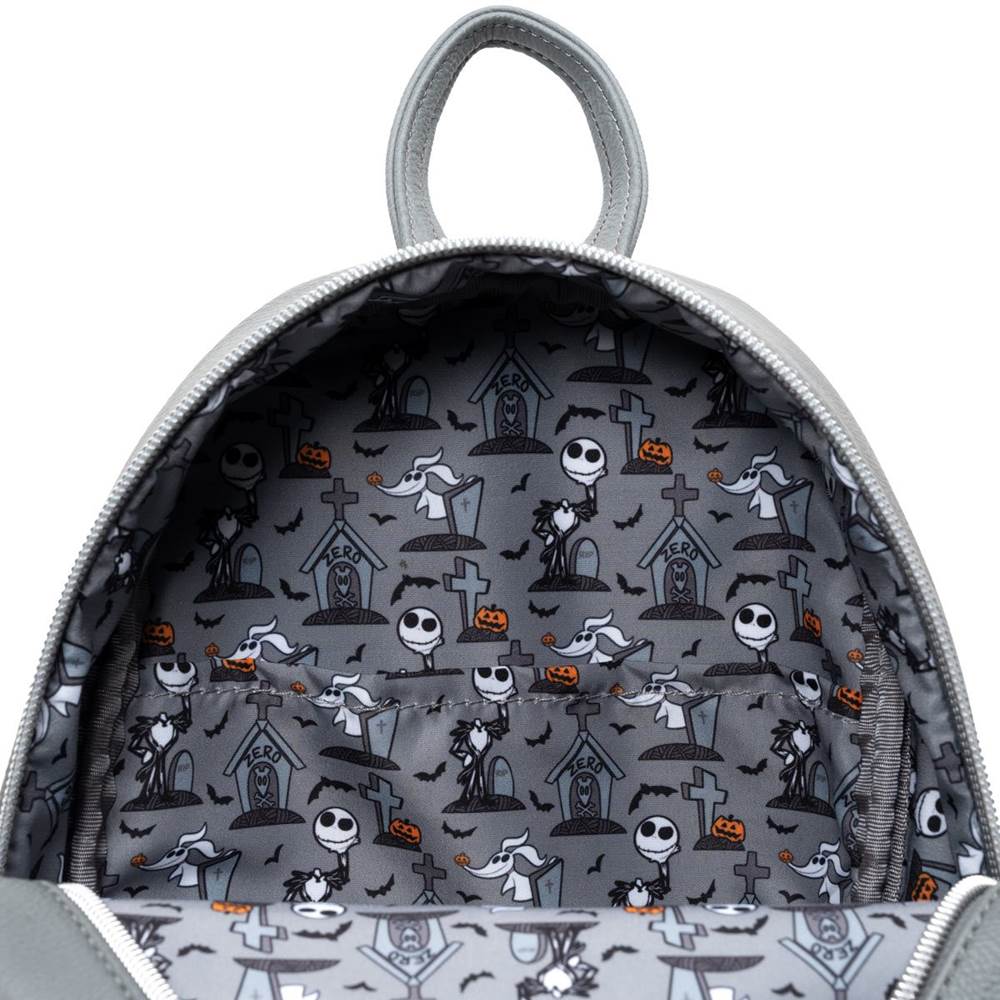 - As for the Nightmare Before Christmas bag, this mini backpack features the spirited dog Zero on the front rising above his dog house. Inside are a doggy skull and crossbones and behind him is a cross that looks like a grave marker. Zero and the crossbones glow in the dark giving this bag an extra dose of Halloween fun.