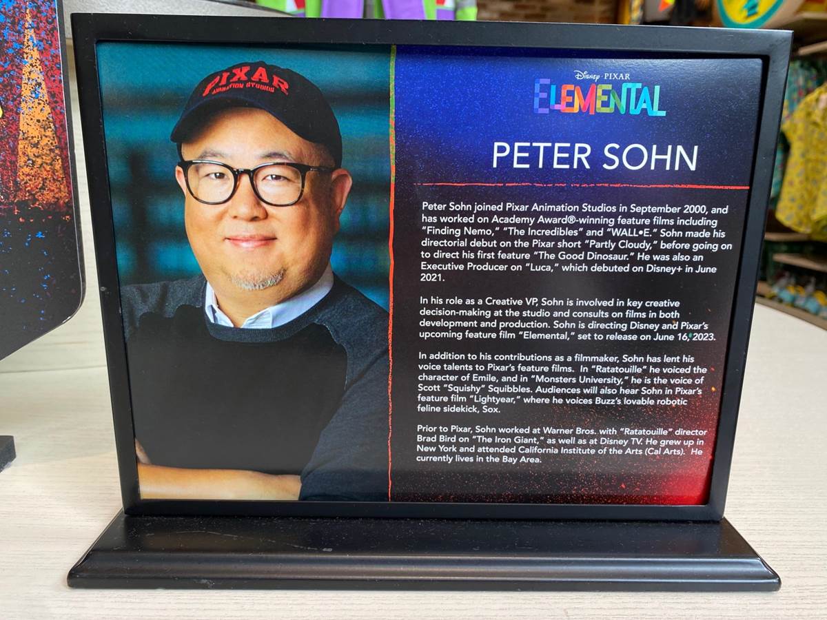 This sign in place alongside the merchandise tells the story of Elemental’s director, Peter Sohn.