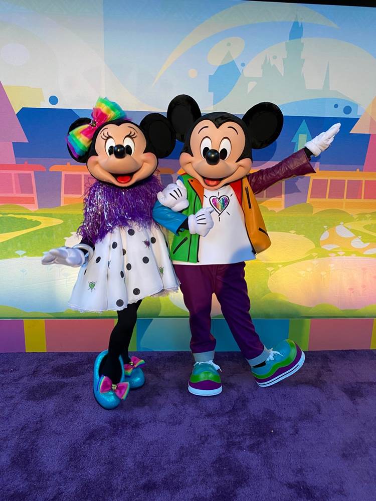 Mickey and Minnie donned brand-new, colorful outfits for the event, posing in front of an equally colorful backdrop of Disneyland.