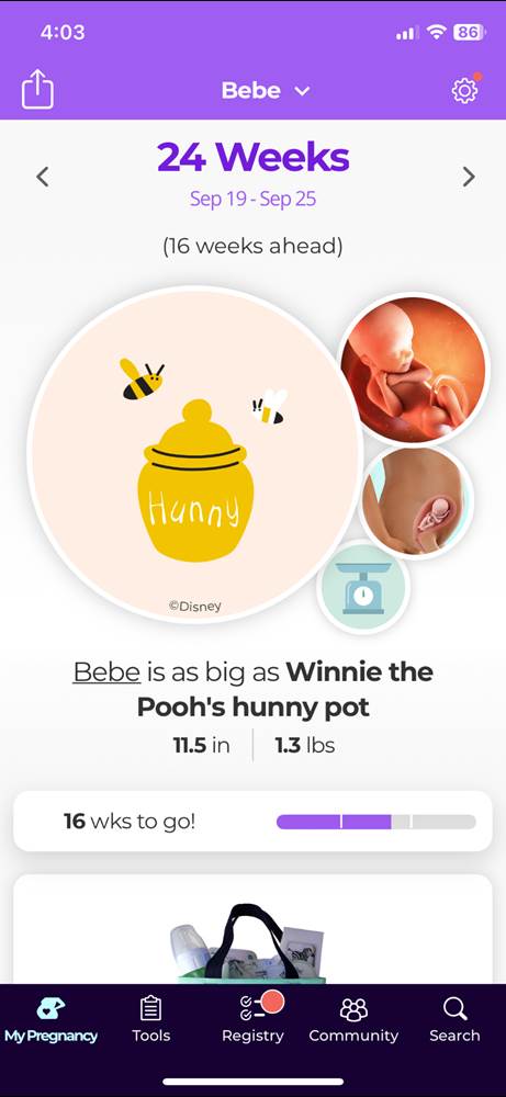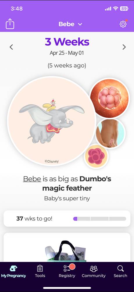 - Switch to Disney Baby Milestones by tapping the size comparison, then swipe through your options and find the Disney Baby Milestones category. Tap the small check, and ta-da! — reveal the Disney Baby-inspired item that’s about the same size as your baby this week. Tap “view all" to take a peek at your entire pregnancy (or stop scrolling if you want to be surprised each week).