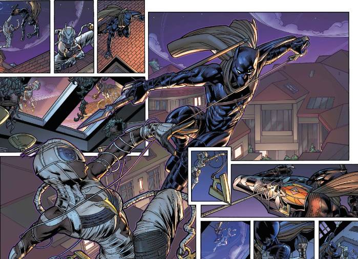 - A special first look at “Black Panther #2" puts the spotlight on Beisa. On one page, she lurks around Birnin T’Chaka after dark. On another, she and T’Challa engage in airborne combat above the city rooftops in a glorious double-page spread. The last page shows scientists huddled around an in-stasis Deathlok.