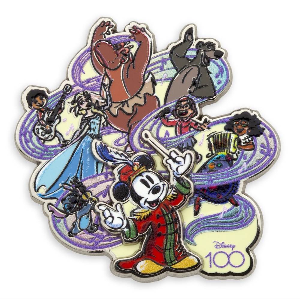 - The characters are featured against a variety of colorful backgrounds and are surrounded by swirling musical staffs and notes, as well as the signature Disney100 logo.
