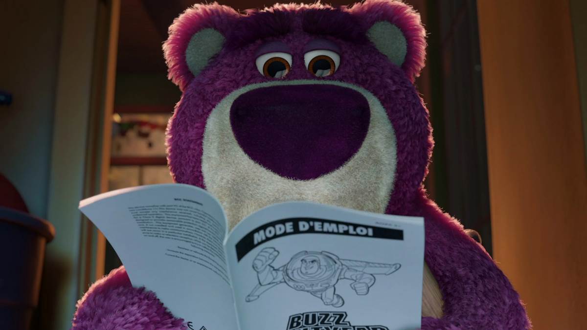 - In Pixar Animation Studios’ Toy Story 3, Lotso serves as the primary villain, running the daycare center and the toys with an authoritarian hand–or paw. Though he is designed as a jumbo, extra-soft teddy bear with a pink and white plush body and a velvety purple nose (and smells like strawberries!), He is one of the most sinister villains in the Pixar universe, sending Woody, Buzz, and the others to an almost certain doom in a landfill incinerator.