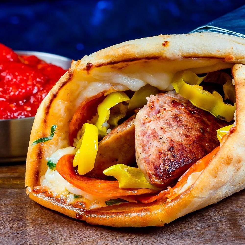 - Shawarm-izza at Shawarma Palace: Italian sausage, pepperoni, mozzarella, and pepperoncini in a garlic-parmesan wrap with marinara dipping sauce