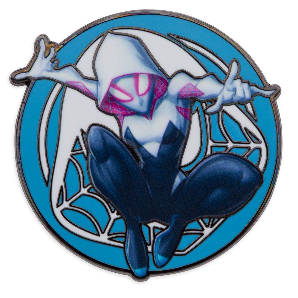 - Spider-Man and Ghost-Spider have swung in to join the party and each hero stars on their own pins. Both are in their heroic costumes and striking action poses in front of their popular logos.