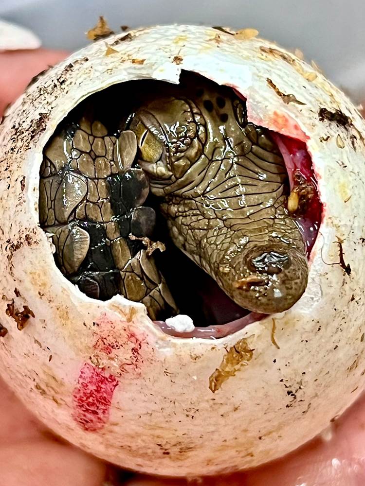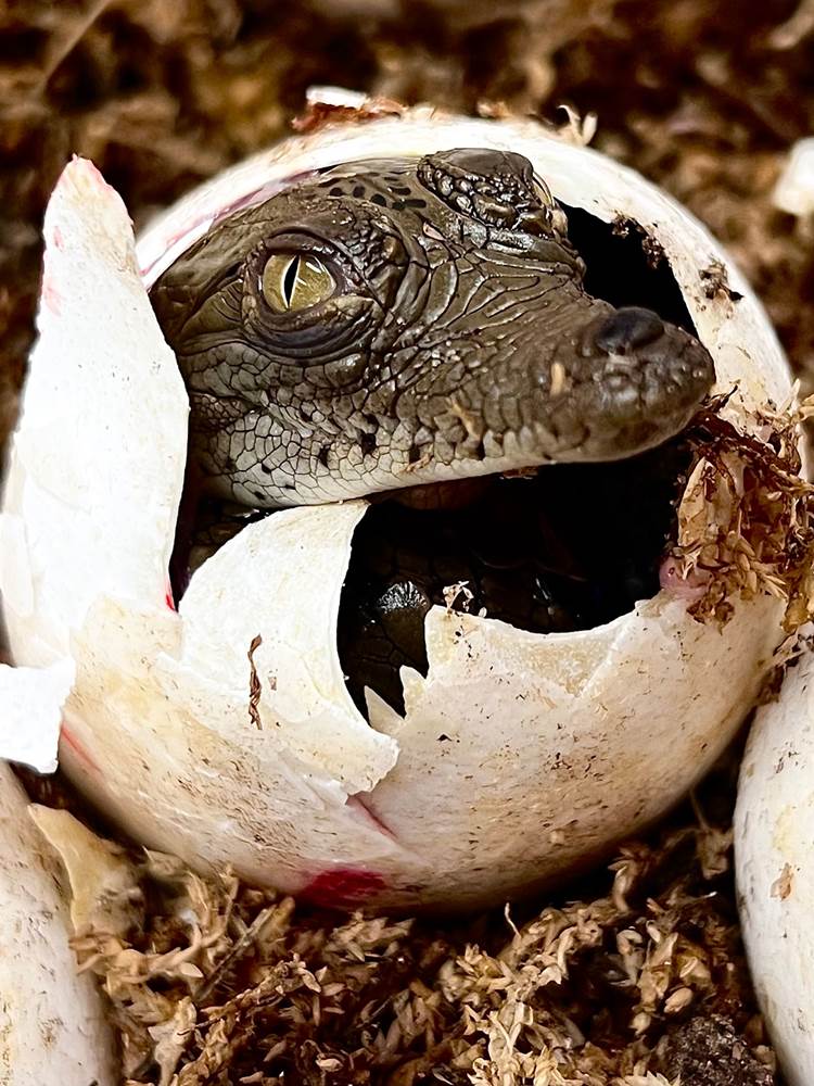 - It’s hard work for the baby crocs to break free from their eggshell, and sometimes staff will help them by gently cracking the egg and making an initial opening for the babies to poke their noses out for their first breath of air.