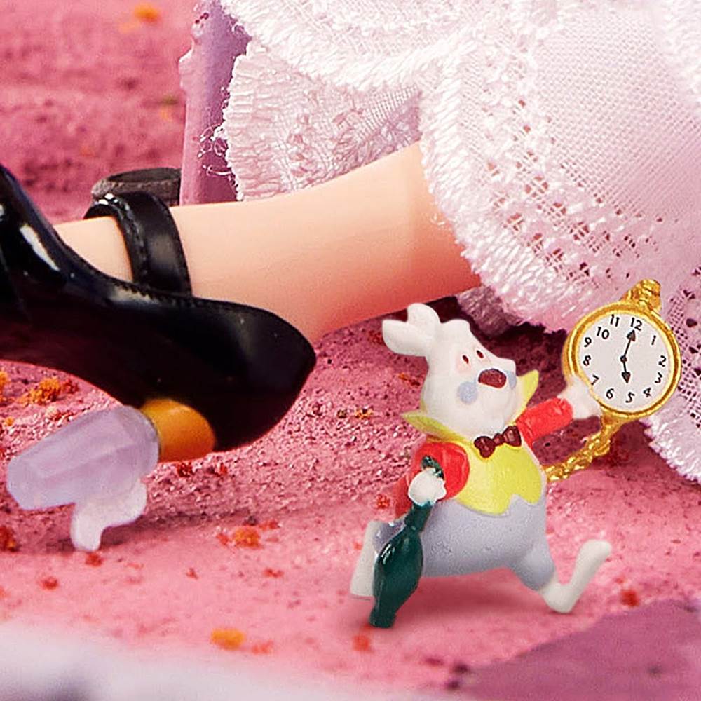 - Since this is recreation of an iconic scene the doll comes with a colorful three-sided house featuring intricate sculpting. The set includes a White Rabbit figure and pieces of his furniture.