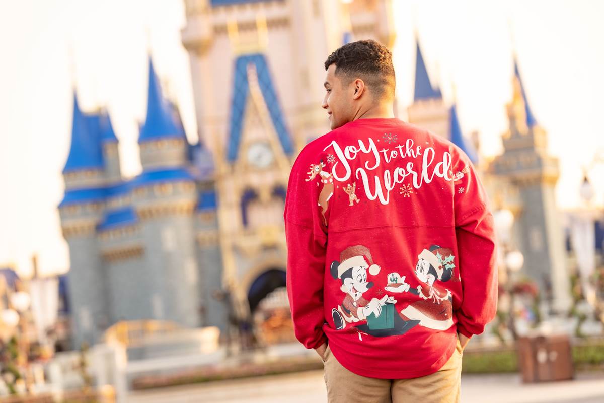 - Showcased are a red Spirit Jersey featuring Mickey and Minnie, a pin and a mug of Mickey as Santa, and a youth T-Shirt featuring Mickey holding a present which says Mickey’s Very Merry Christmas Party on it.
