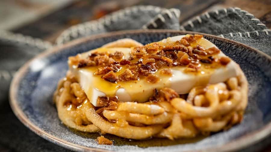- Candied Bacon Funnel Cake: Funnel Cake topped with Vanilla Ice Cream, Candied Bacon, and Maple Syrup Drizzle (New)