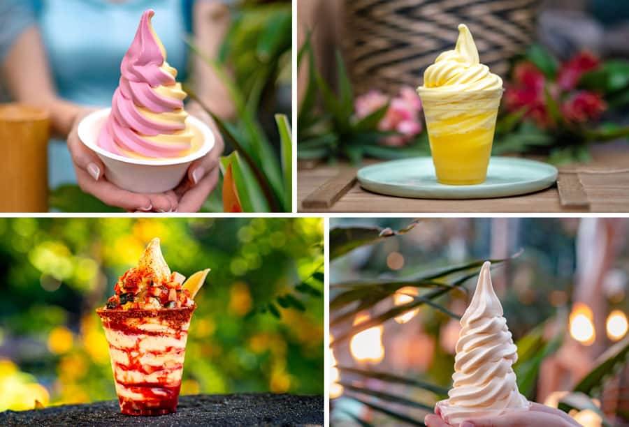 - Tropical Themed DOLE Whip Cone: DOLE Whip strawberry and vanilla soft-serve in a white chocolate, coconut-dipped waffle cone