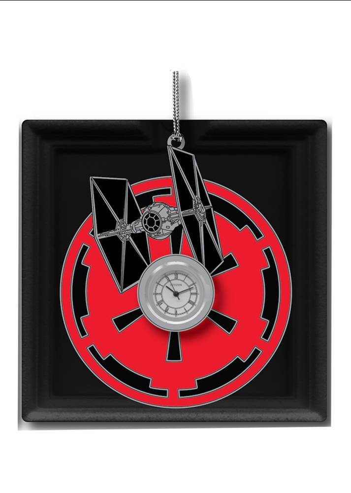 - This silver-plated collectible features a meticulously crafted TIE fighter ship, complete with a working clock. This design is expertly etched and colored in striking red and black, capturing the essence of the Galactic Empire.