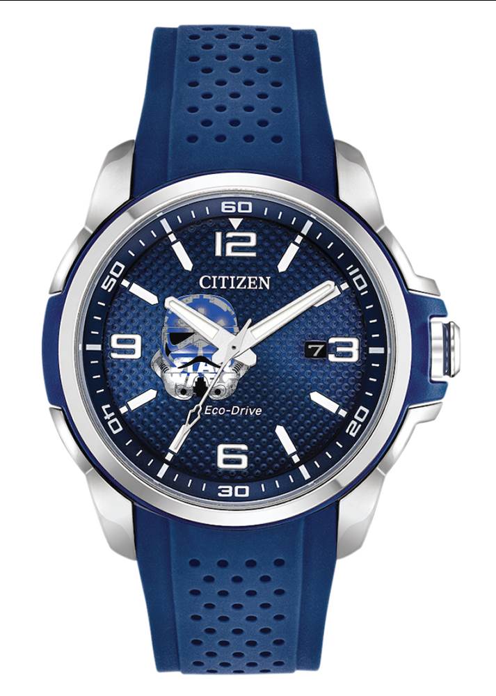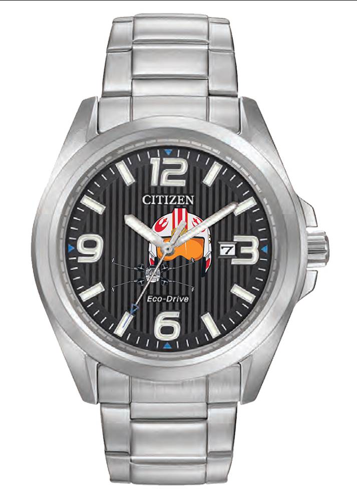 - Inspired by the daring adventures of the humble farm boy from Tatooine, the fight-ready watch is driven by Citizen’s proprietary Eco-Drive technology to provide light-powered vitality without ever needing a battery. A silver-tone stainless steel case with a blue aluminum bezel serves as the canvas for the design, complemented by blue and green accented chronograph pushers representing the colors of Skywalker's lightsabers. On the dial, a sectored blue style features an inner motif of the symbol of the Rebel Alliance, while an image of Skywalker's X-wing and a scene of his iconic struggle with Darth Vader mark the top and bottom sub-dials. The watch is presented on a brown leather strap, giving a soft detail to an otherwise robust design and providing an elegant touch to the bold chronograph.