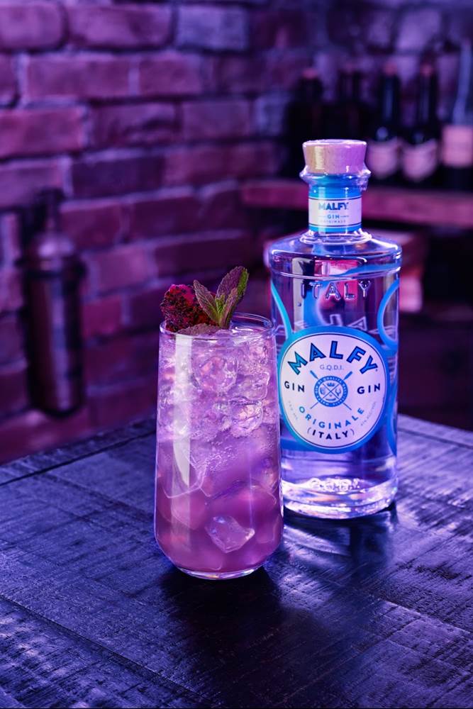 - Butterfly pea infused gin, St-Germain, prosecco, lemon juice and honey syrup