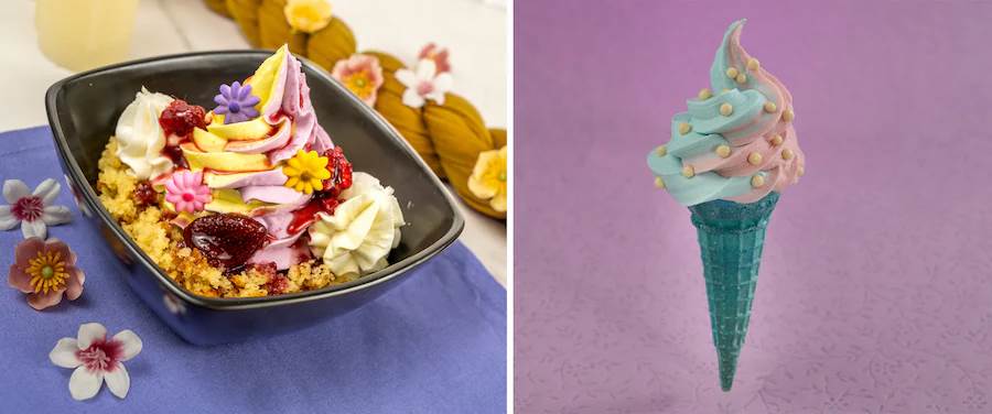 - Rapunzel Cone: DOLE Whip lemon and DOLE Whip raspberry swirled in a lavender cone with sugar flowers (New)