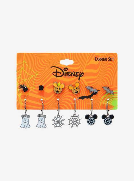 Finally accessorize all month long and on your next Disney vacation the Halloween Earrings set that feature spider webs, Mickey Mouse as a ghost, bats, pumpkins, and simple black studs.