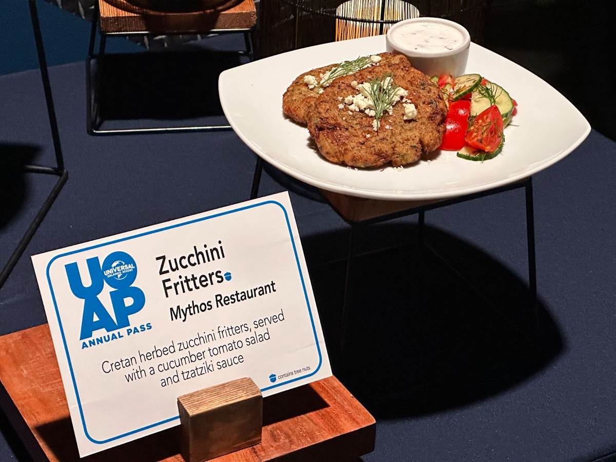 - Also in Islands of Adventure, Mythos will be offering Zucchini Fritters, with a cucumber tomato salad and tzatziki sauce.