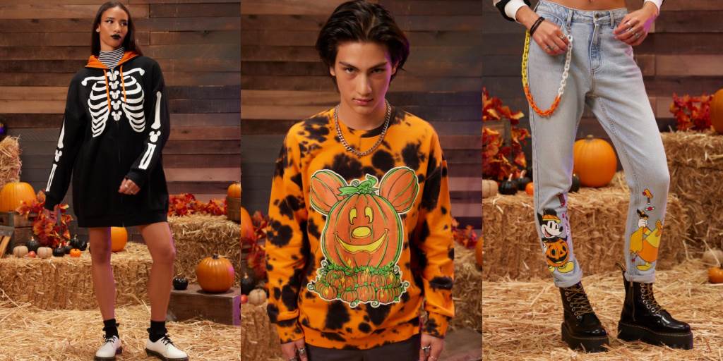 Finally, fans can take one final bold approach with the Mickey Mouse pumpkin sweatshirt featuring a bright orange tie-dye pattern, or opt for the subtler route via Mom jeans embellished with a candy corn colored chain at the hip and screen printed vintage characters around the ankles.