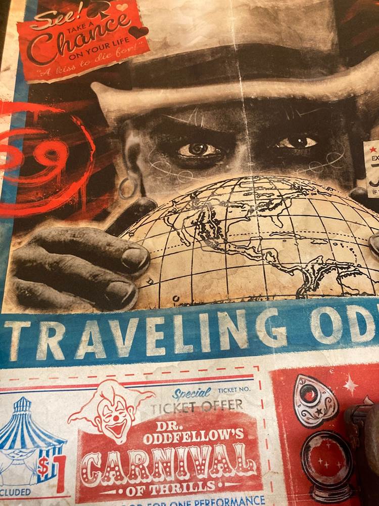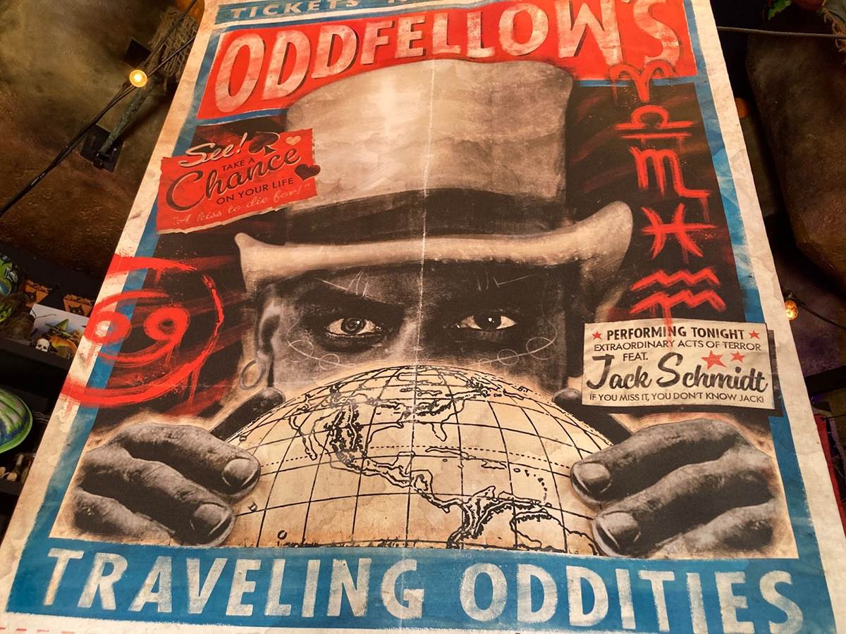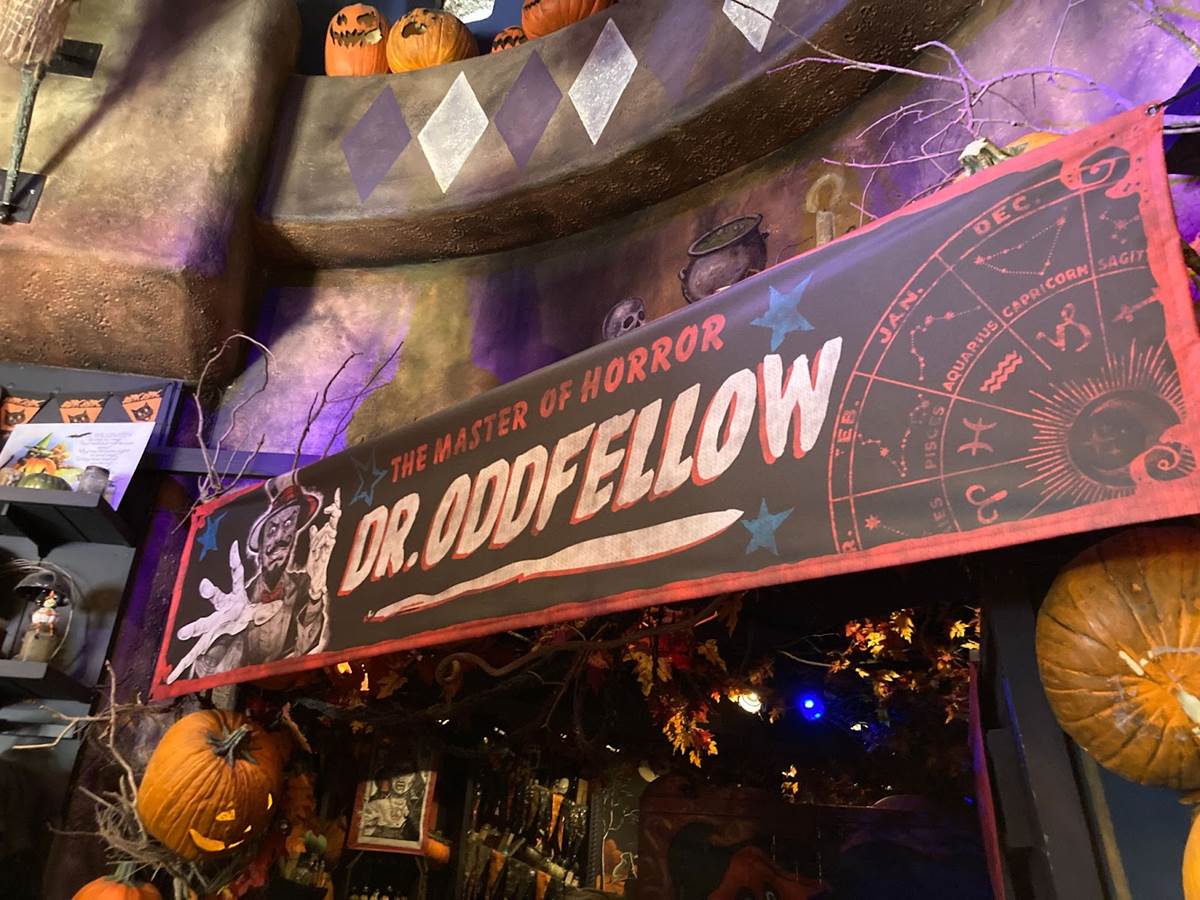 - A large marquee for “Dr. Oddfellow’s Traveling Oddities" greets guests as they enter the store.