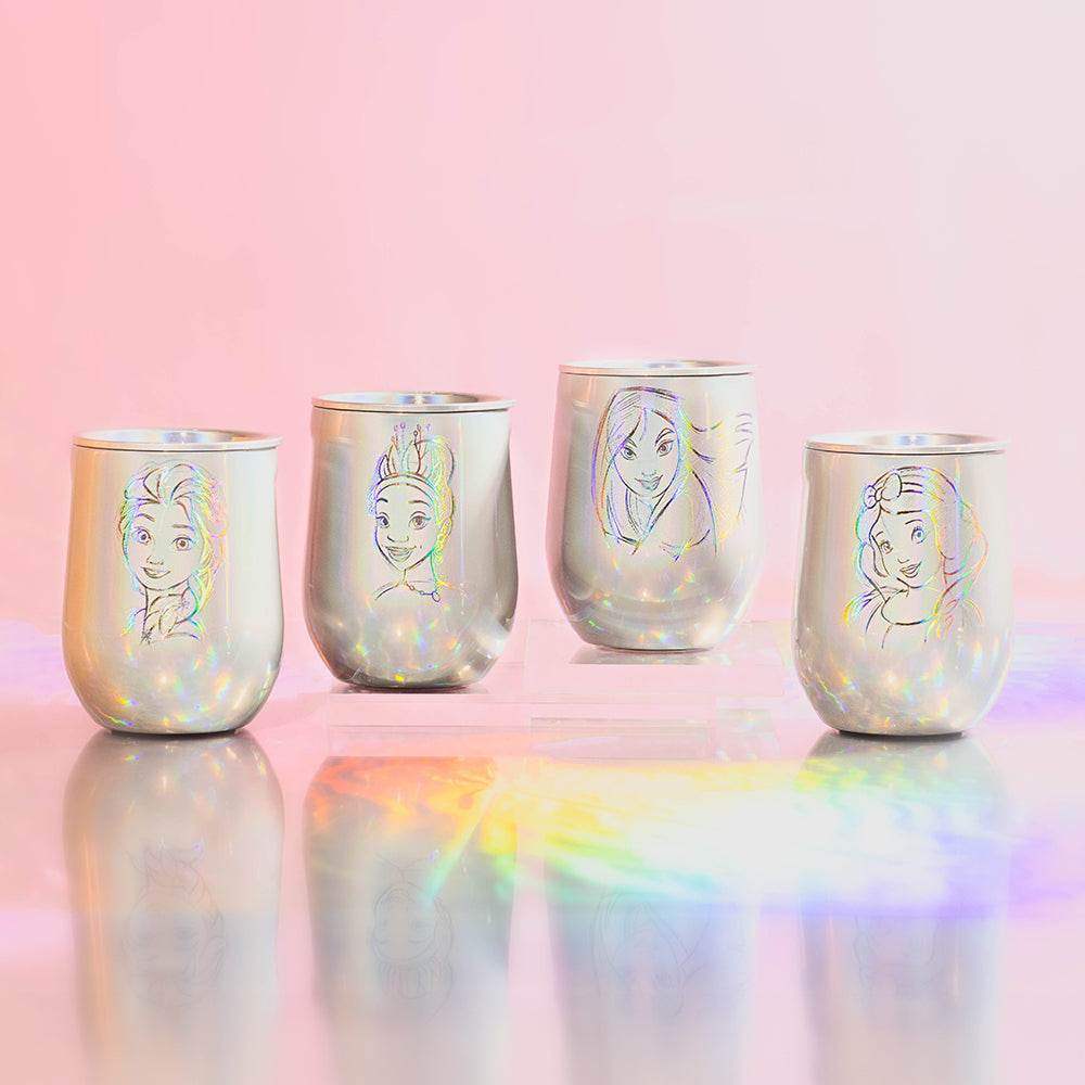 “Celebrate 100 years of magic with all-new Disney100 Brave and Brilliant Gift Set. Packaged in a branded gift-ready box, this enchanting set features four Prismatic Stemless Cups decorated with heritage sketches inspired by four of Disney's most beloved heroines - Tiana, Elsa, Mulan, and Snow White."