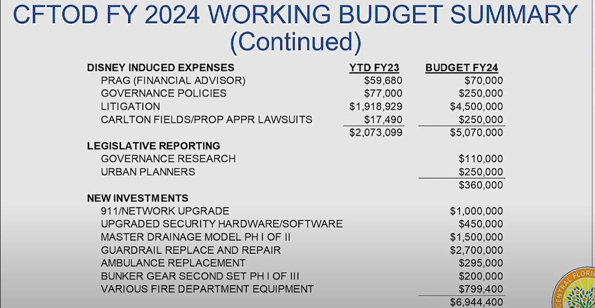 The Central Florida Tourism Oversight District released their 2024 Working Budget Summary today and it includes a large sum of money dedicated toward litigation against Disney.