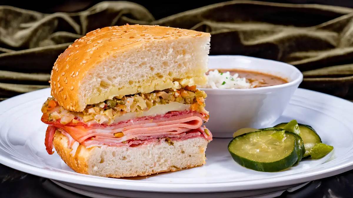 Mortadella, Salami, Rosemary Ham, Cheddar, Provolone and House-made Olive Relish on Toasted New Orleans Sesame Seed Bread, served with Red Beans & Rice and House-made Pickles. $14.99