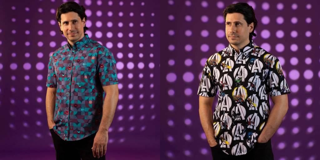 - Then this assortment wraps up with “Super Symbols" a cool almost checkered button down dotted with character icons like a shield, fist, headpiece….