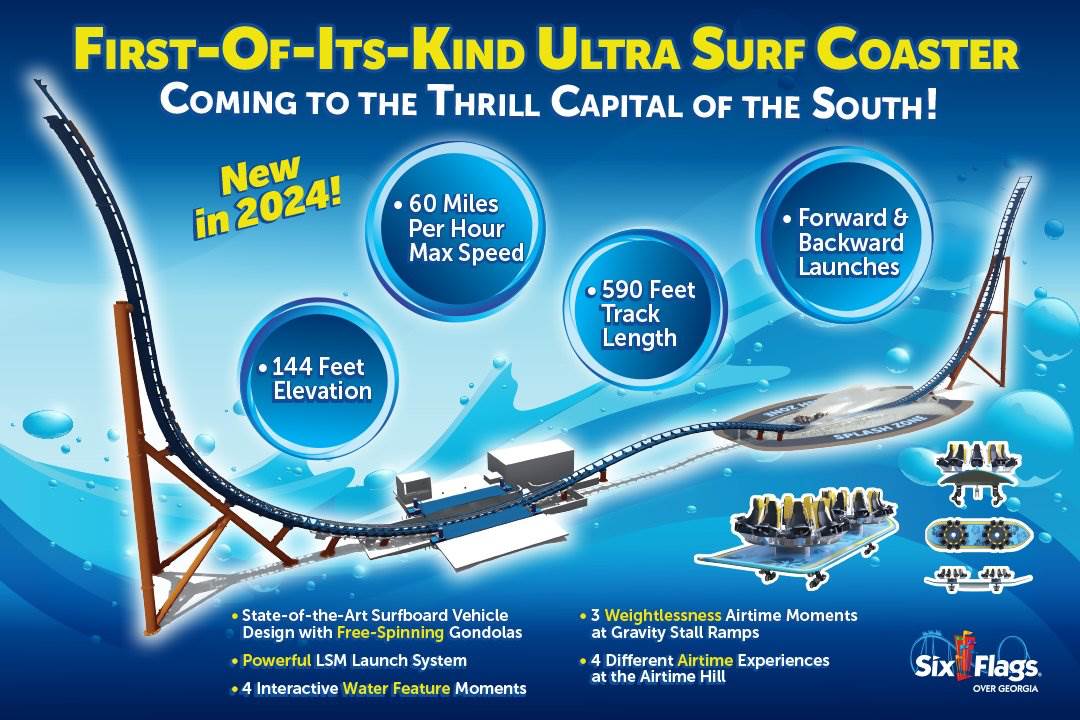 - Six Flags Over Georgia – The first-of-its kind “Ultra Surf" coaster is bringing a totally new coaster experience to the park with a track that launches riders forward and backward surfing at 60 miles per hour through a refreshing splash pool. Free-spinning seats ensures no two rides are alike. While the name of this thriller is still TBD, Six Flags Over Georgia fanatics will be invited to take part in the selection of the coaster’s official name! Follow the park’s social media for details.