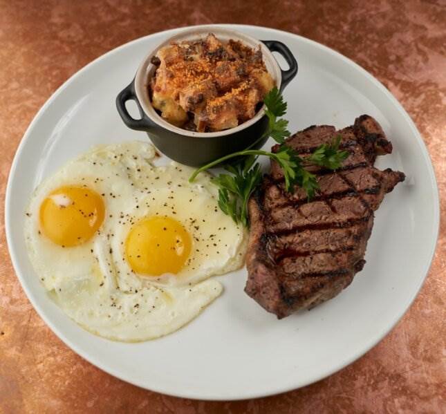 - The Boss – 8 oz. top sirloin steak, eggs choice, cheesy potato casserole