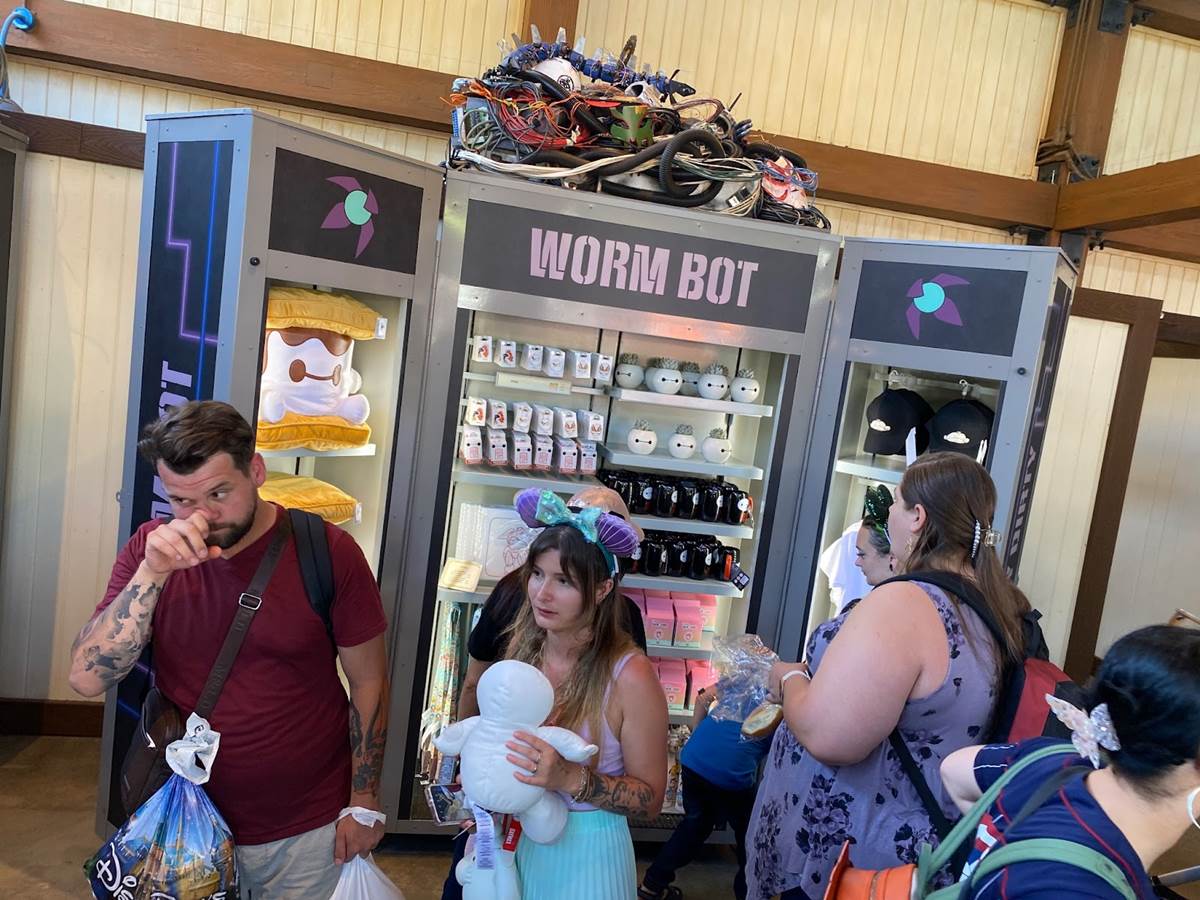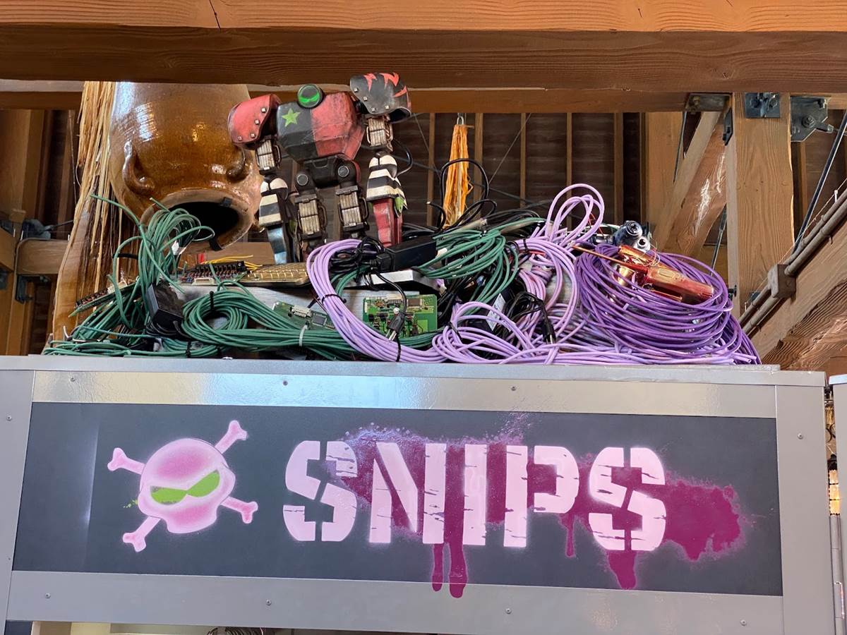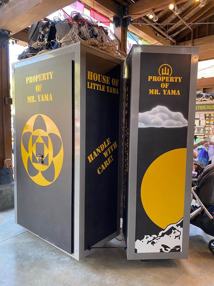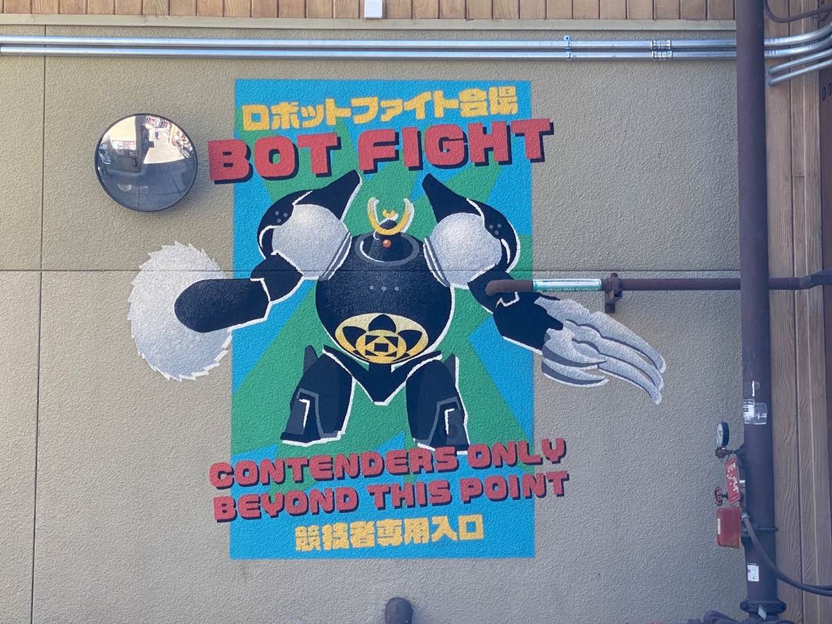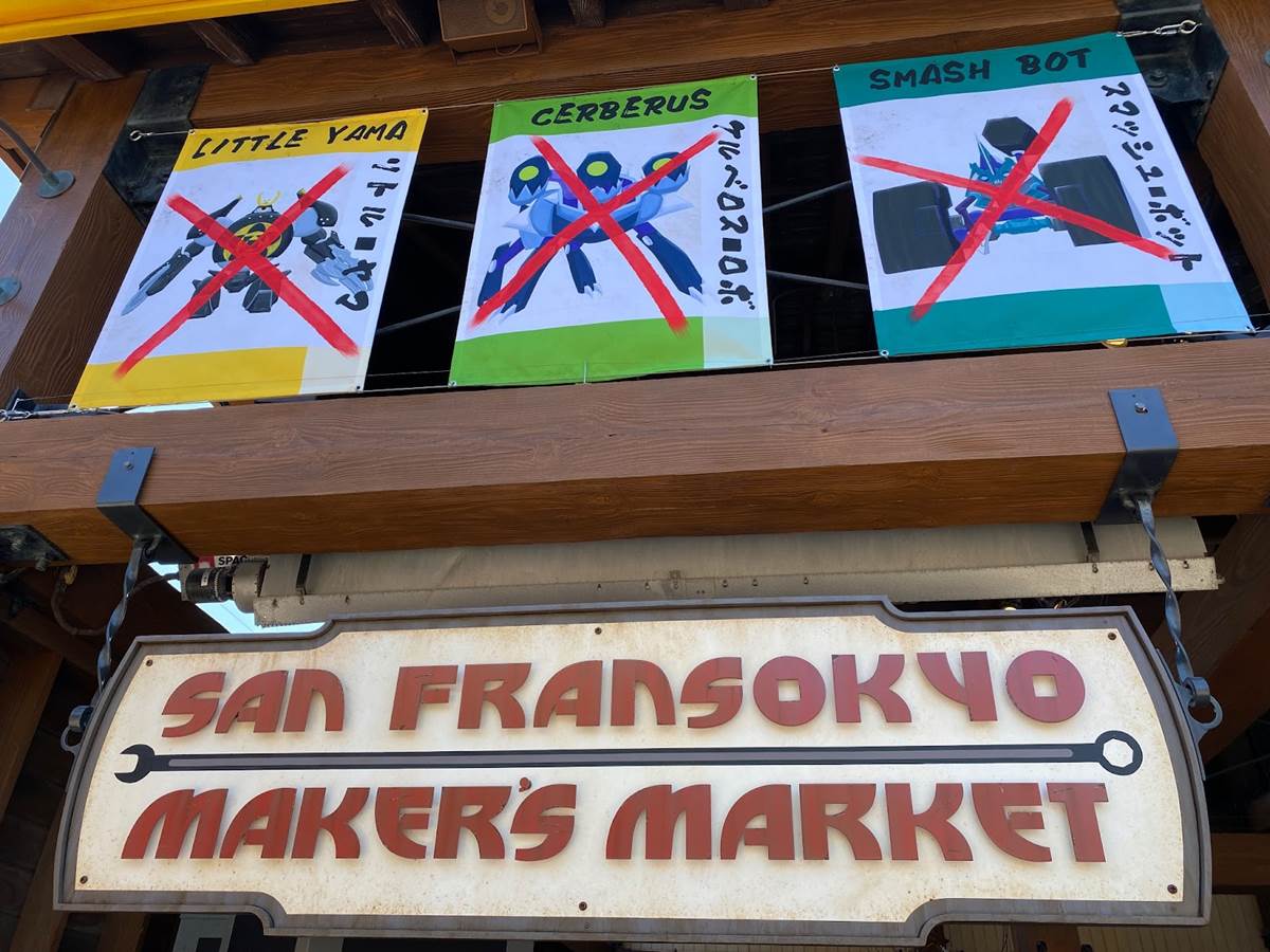 The market’s shelves are situated on robot storage cases, with decommissioned battle bots on display. If you turn a sharp eye to the rafters overhead, you may spot the local battlebot champion, Hiro’s Megabot!