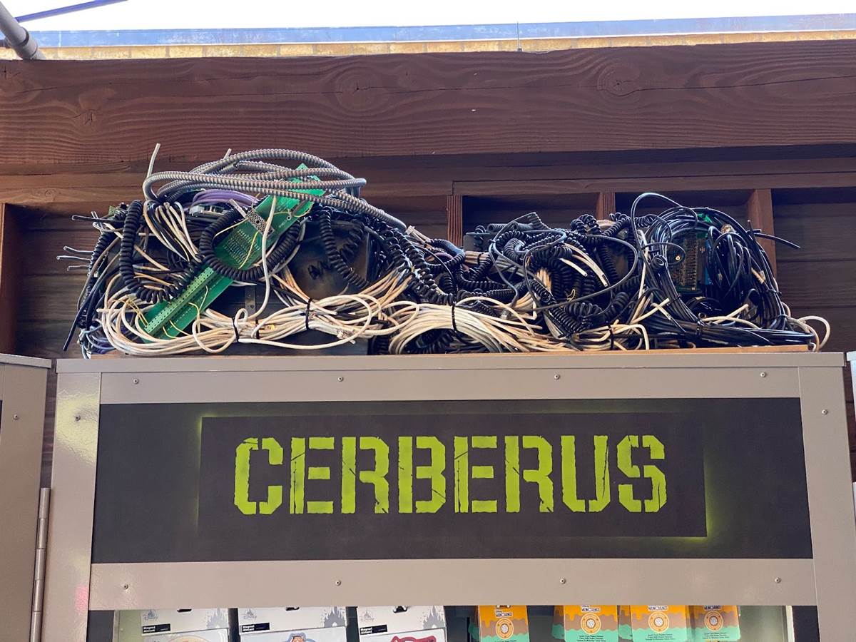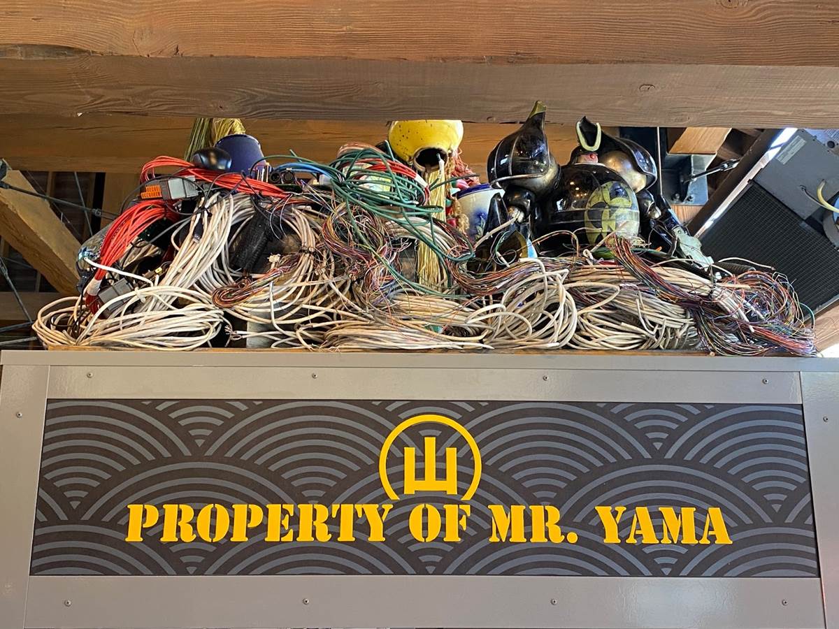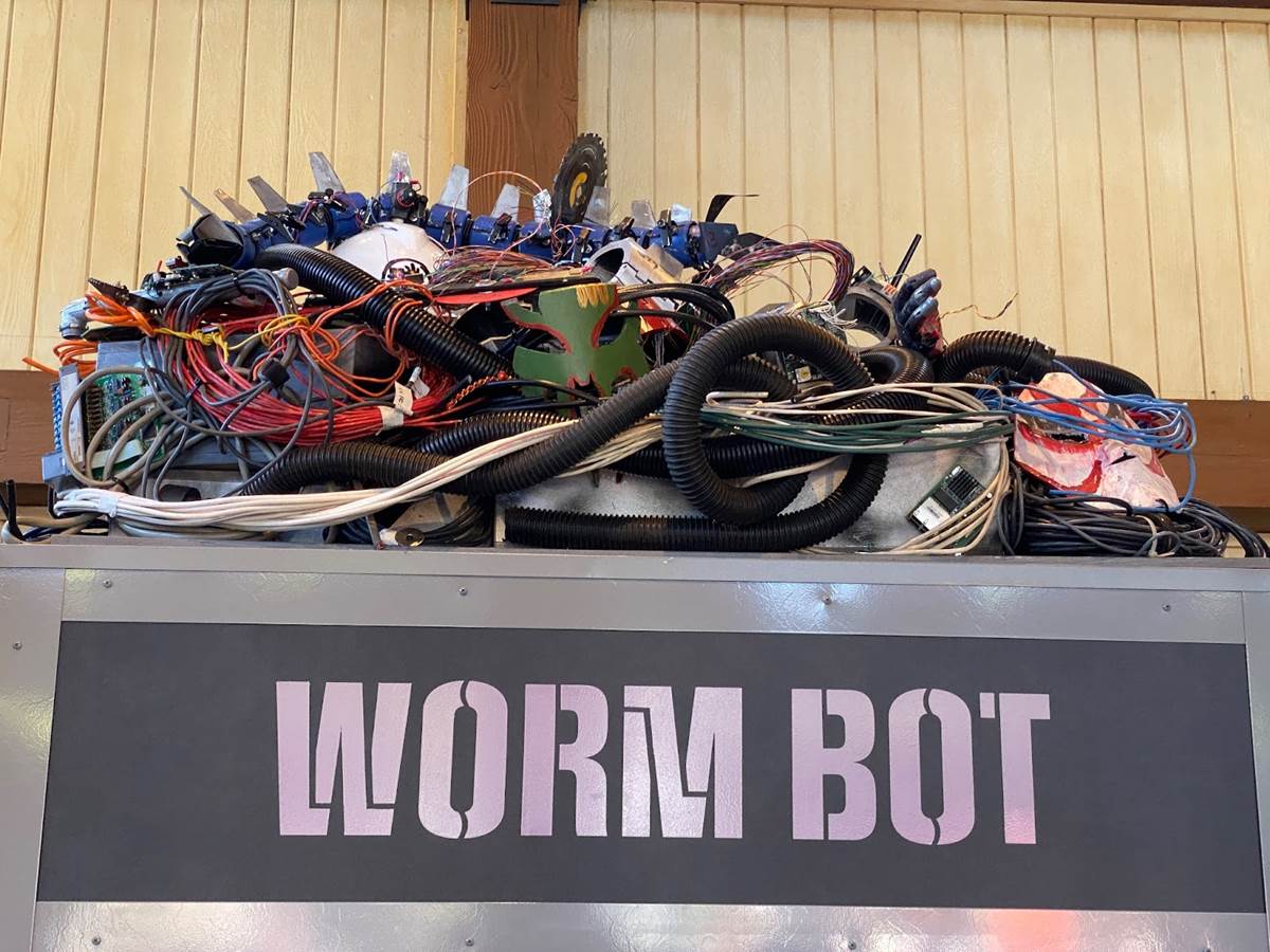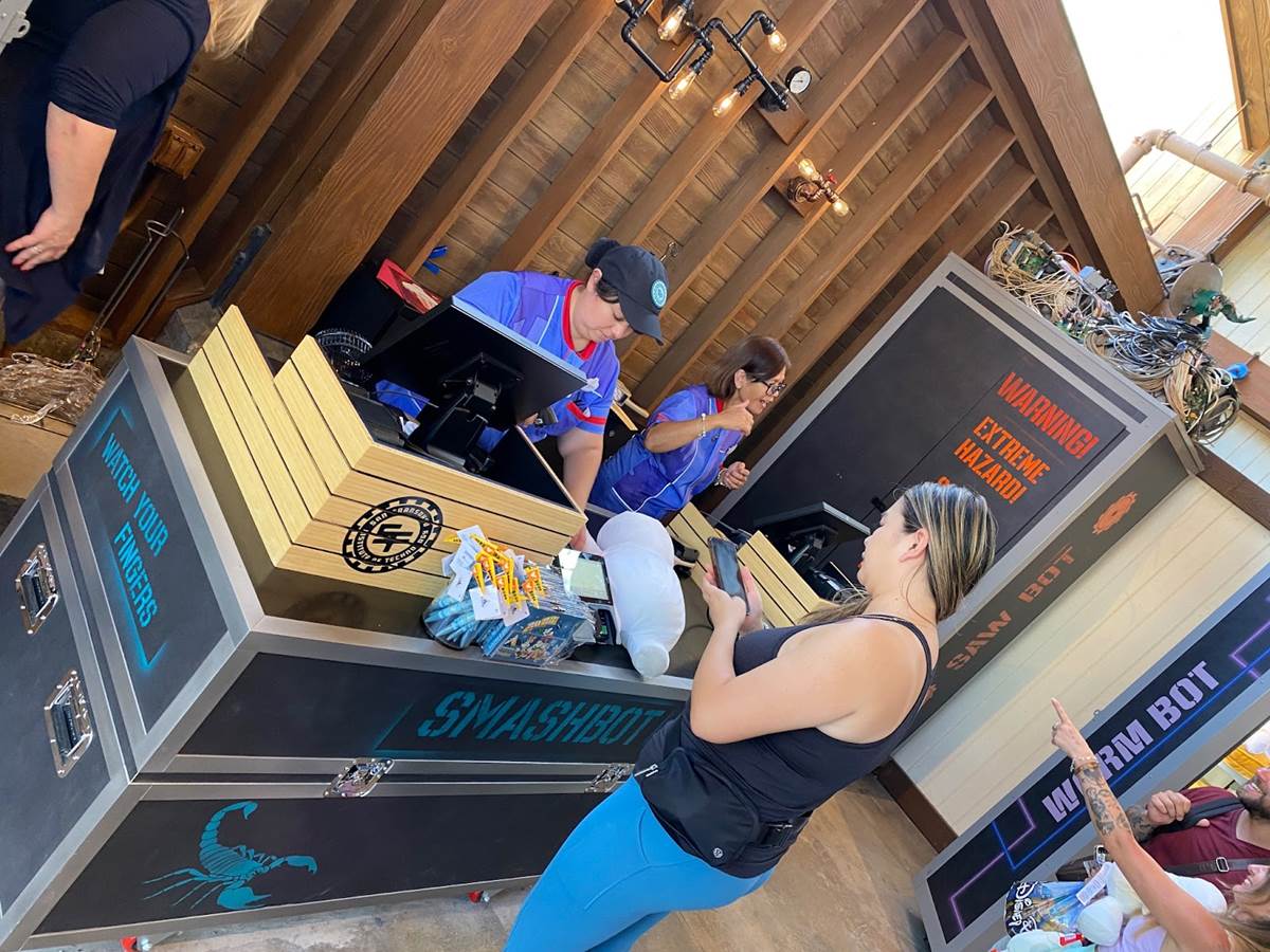 The market’s shelves are situated on robot storage cases, with decommissioned battle bots on display. If you turn a sharp eye to the rafters overhead, you may spot the local battlebot champion, Hiro’s Megabot!