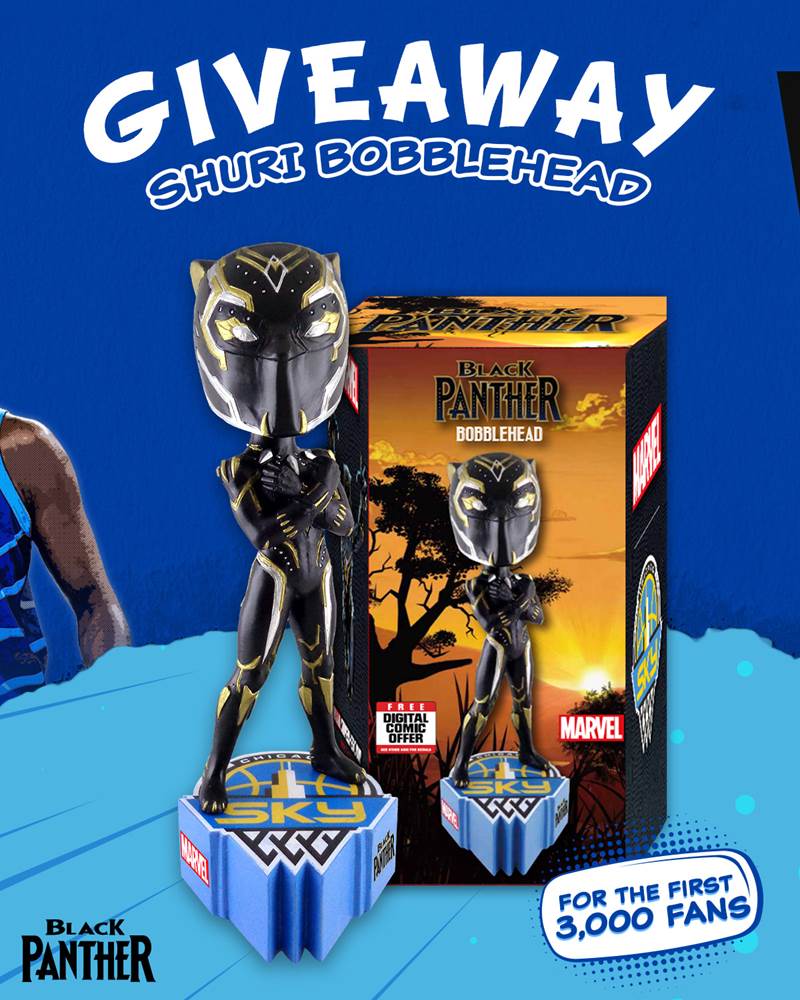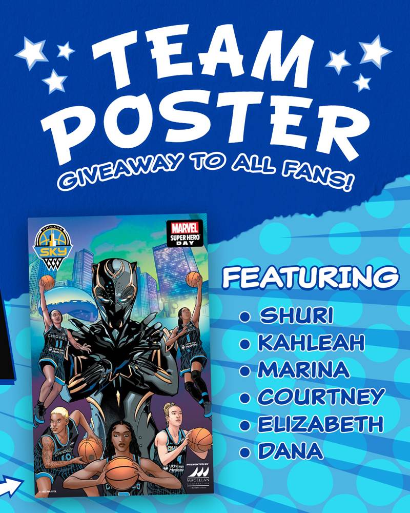 - The first 3,000 fans in attendance will receive a limited edition Shuri Black Panther bobblehead and up to 10,000 fans will receive a souvenir poster featuring star Sky players and Marvel characters.
