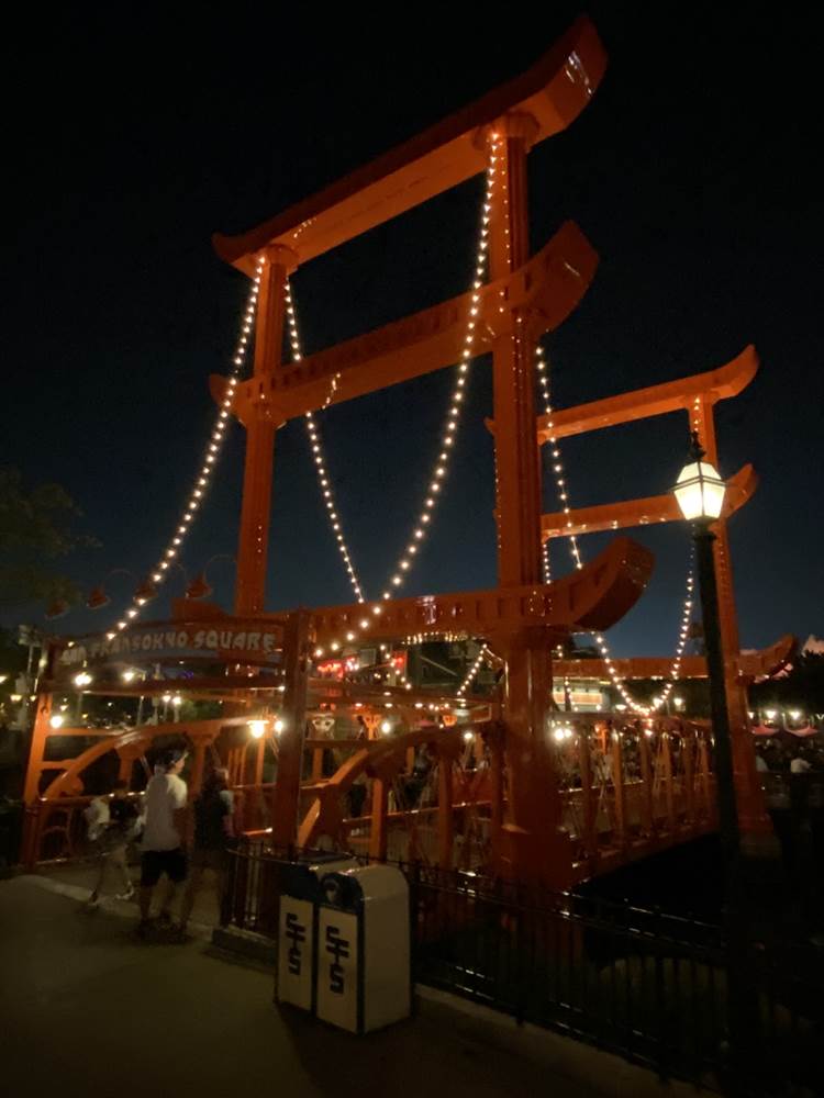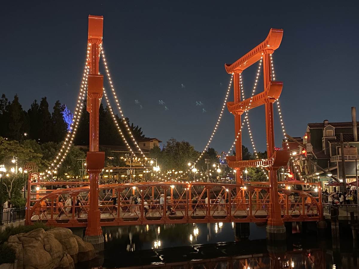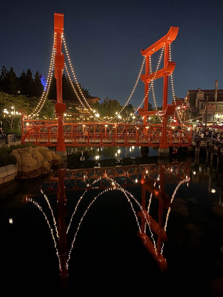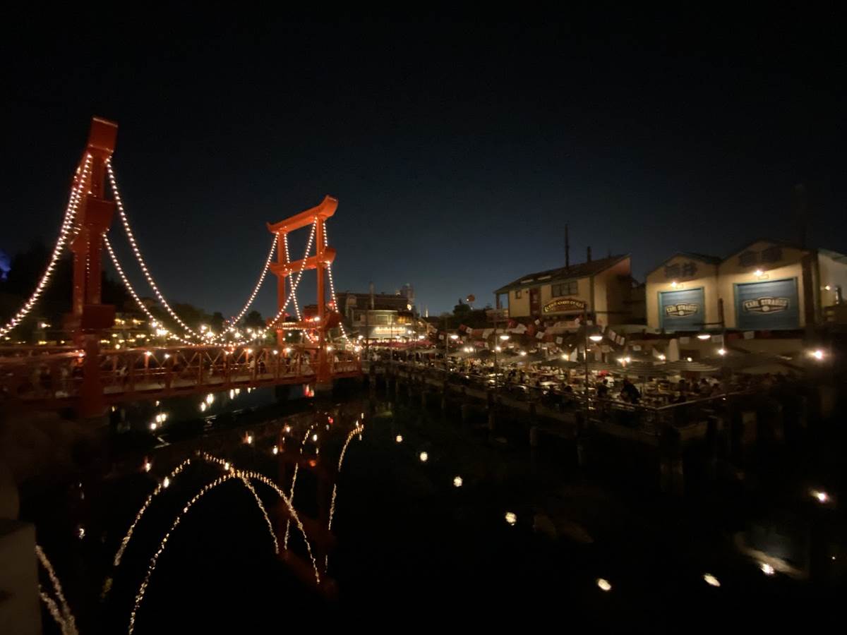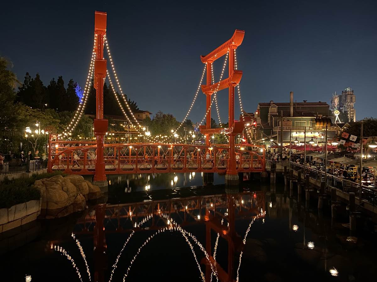 From some of these far shots, you can also see how the full seating area adjacent to the cerveceria is lit up at night. However, the real star of the show in terms of an evening in San Fransokyo Square is the illuminated bridge. Towering over the water adjacent to the entrance of Pixar Pier, guests can see the towers fully illuminated with string lights stretching down along its suspension cables. Based on the sheer amount of our photos alone, fans will likely be staged here getting photos of their own for some time to come.