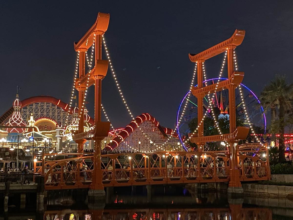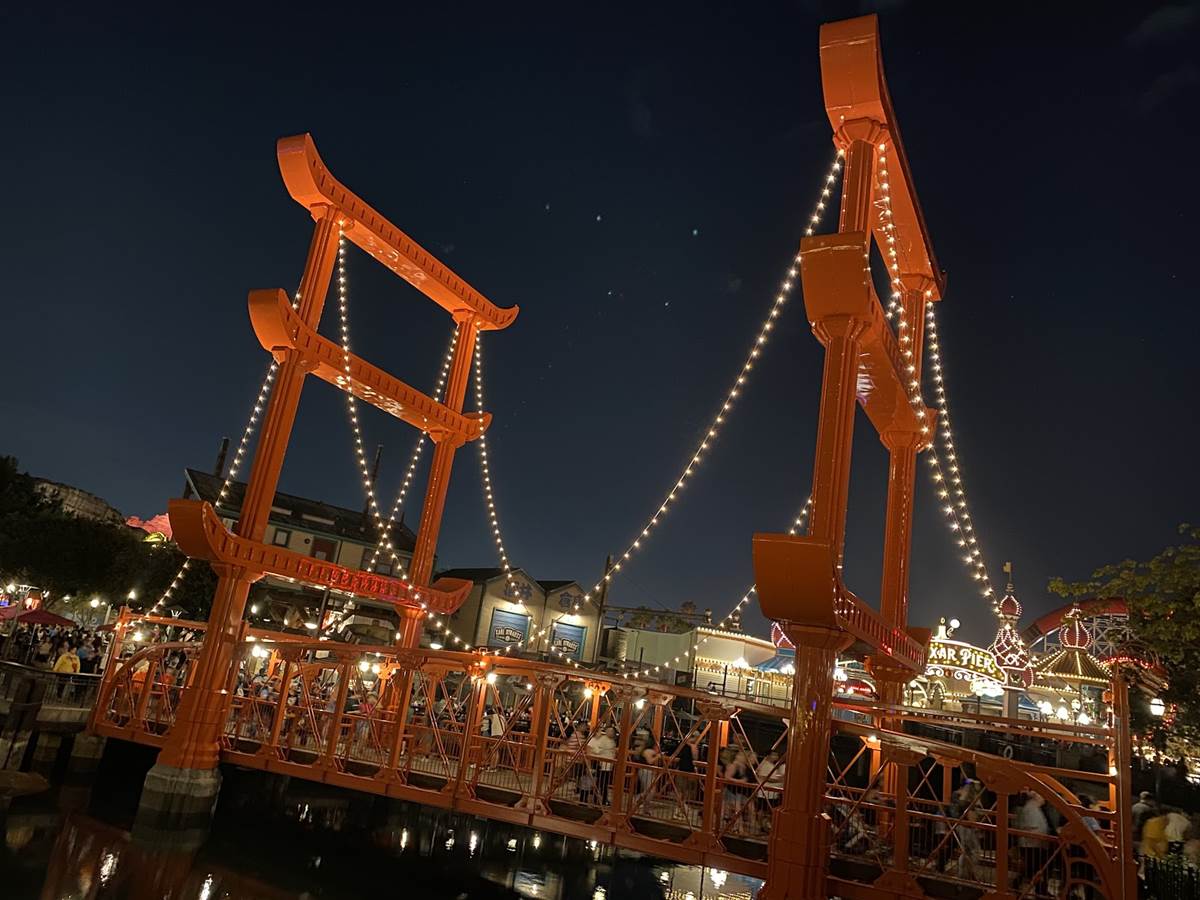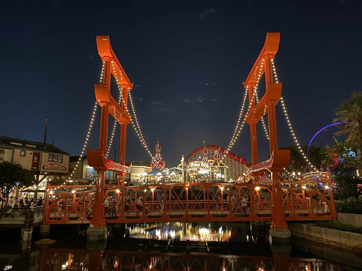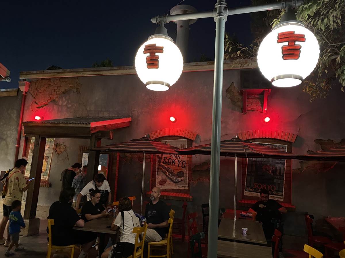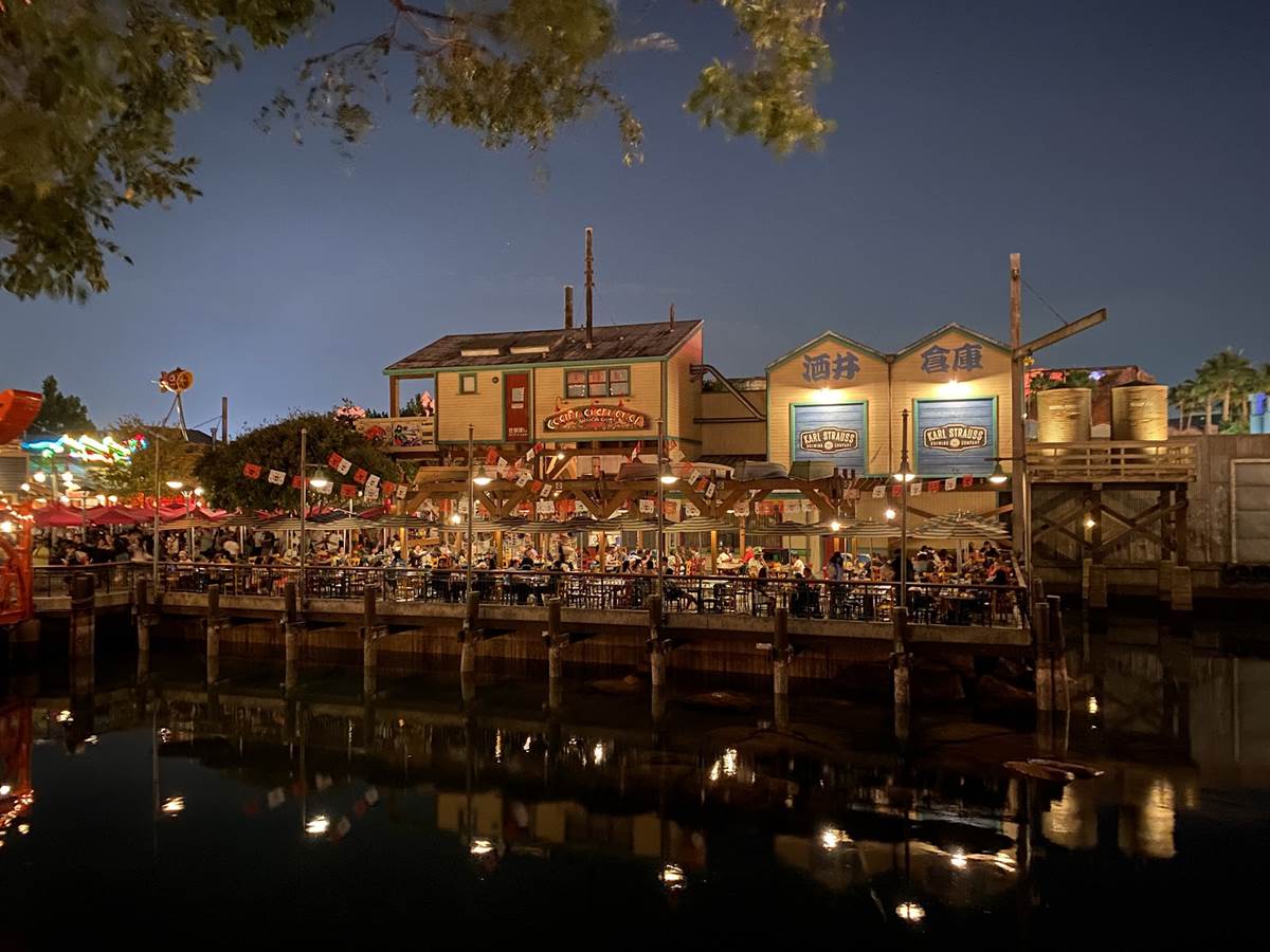 From some of these far shots, you can also see how the full seating area adjacent to the cerveceria is lit up at night. However, the real star of the show in terms of an evening in San Fransokyo Square is the illuminated bridge. Towering over the water adjacent to the entrance of Pixar Pier, guests can see the towers fully illuminated with string lights stretching down along its suspension cables. Based on the sheer amount of our photos alone, fans will likely be staged here getting photos of their own for some time to come.