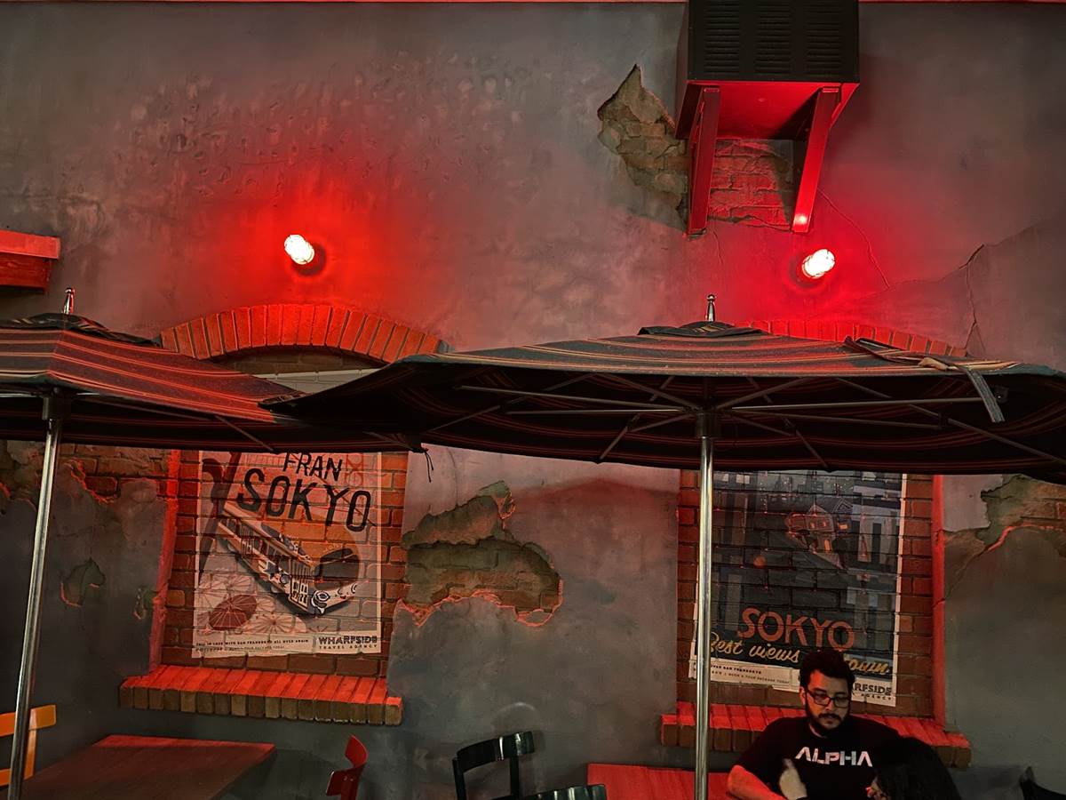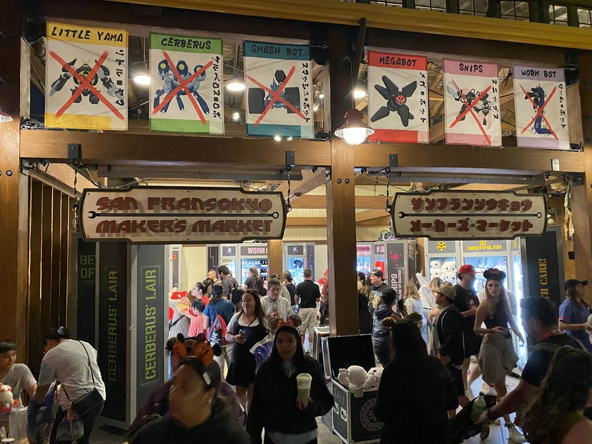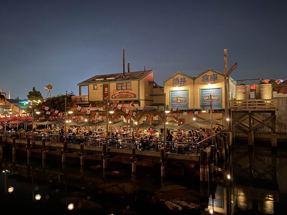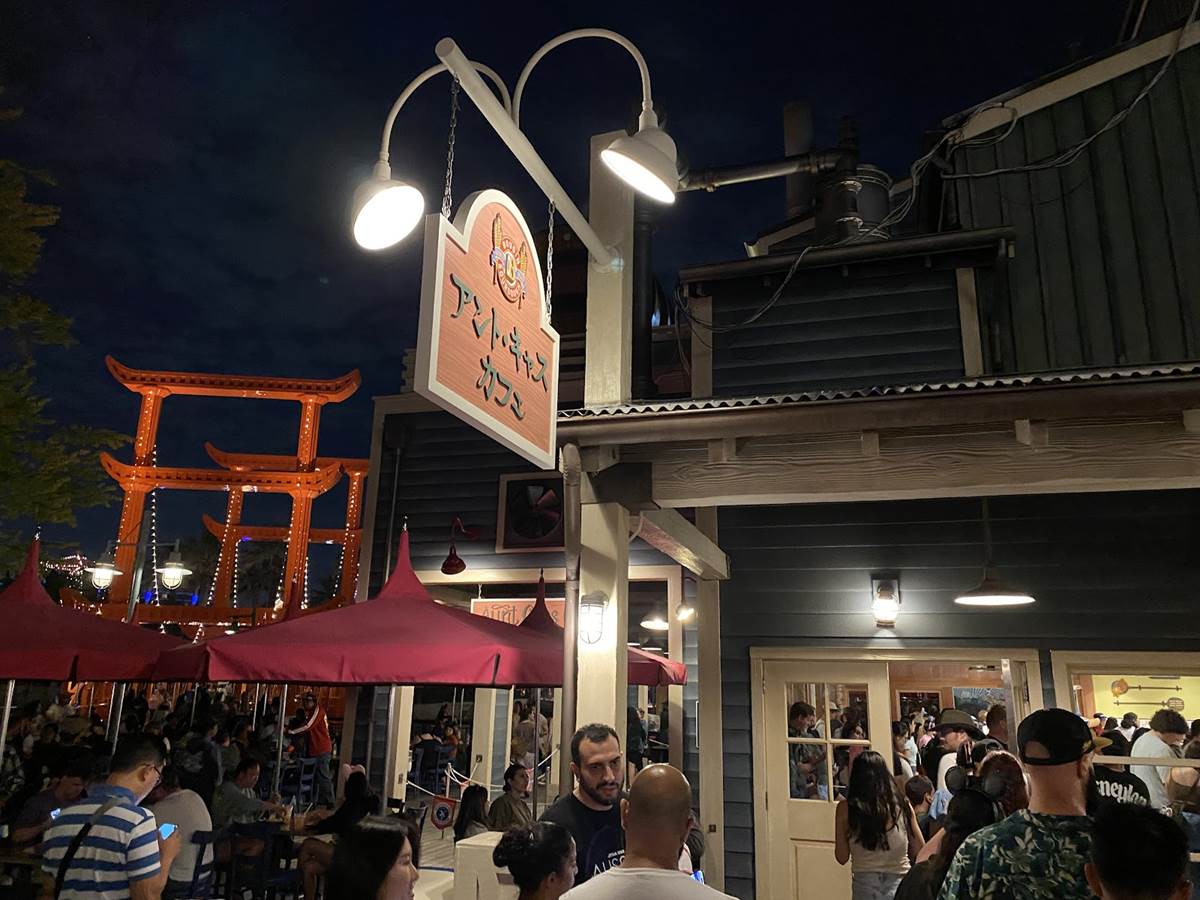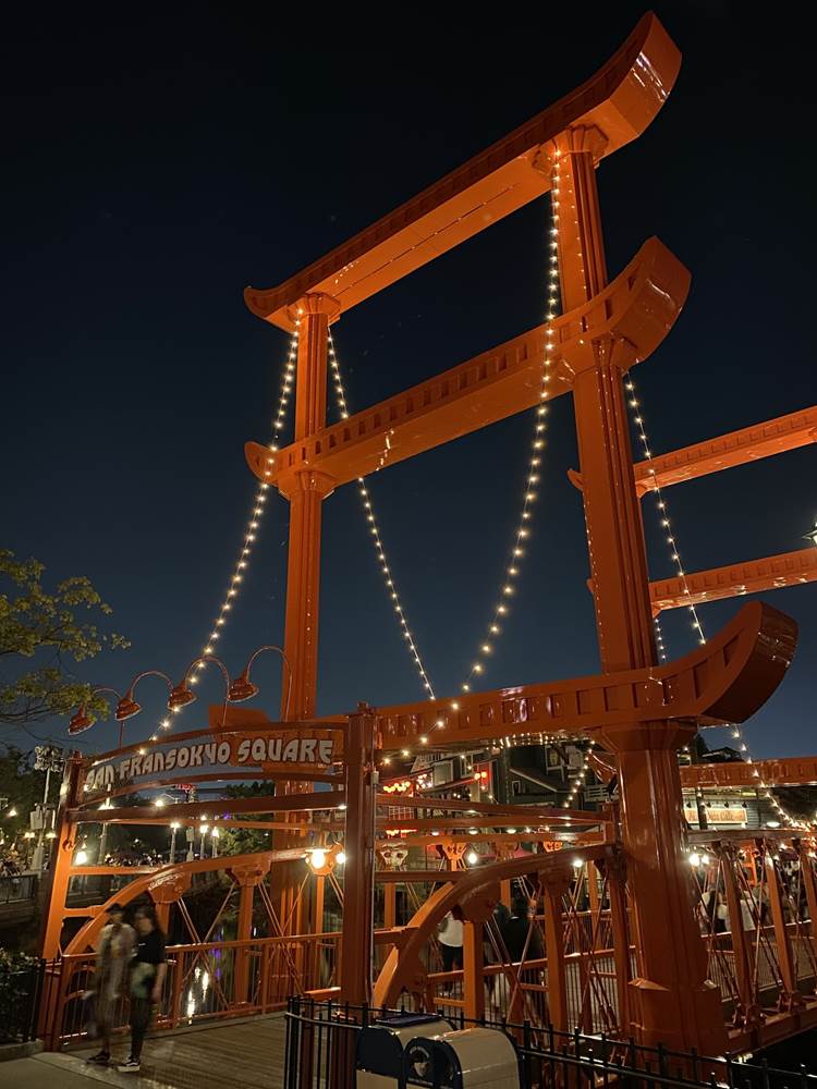From some of these far shots, you can also see how the full seating area adjacent to the cerveceria is lit up at night. However, the real star of the show in terms of an evening in San Fransokyo Square is the illuminated bridge. Towering over the water adjacent to the entrance of Pixar Pier, guests can see the towers fully illuminated with string lights stretching down along its suspension cables. Based on the sheer amount of our photos alone, fans will likely be staged here getting photos of their own for some time to come.
