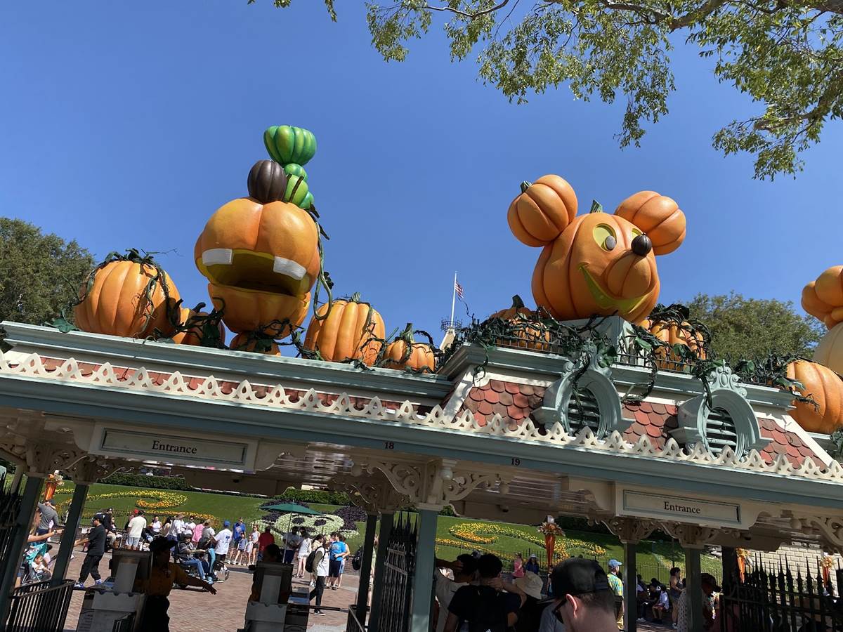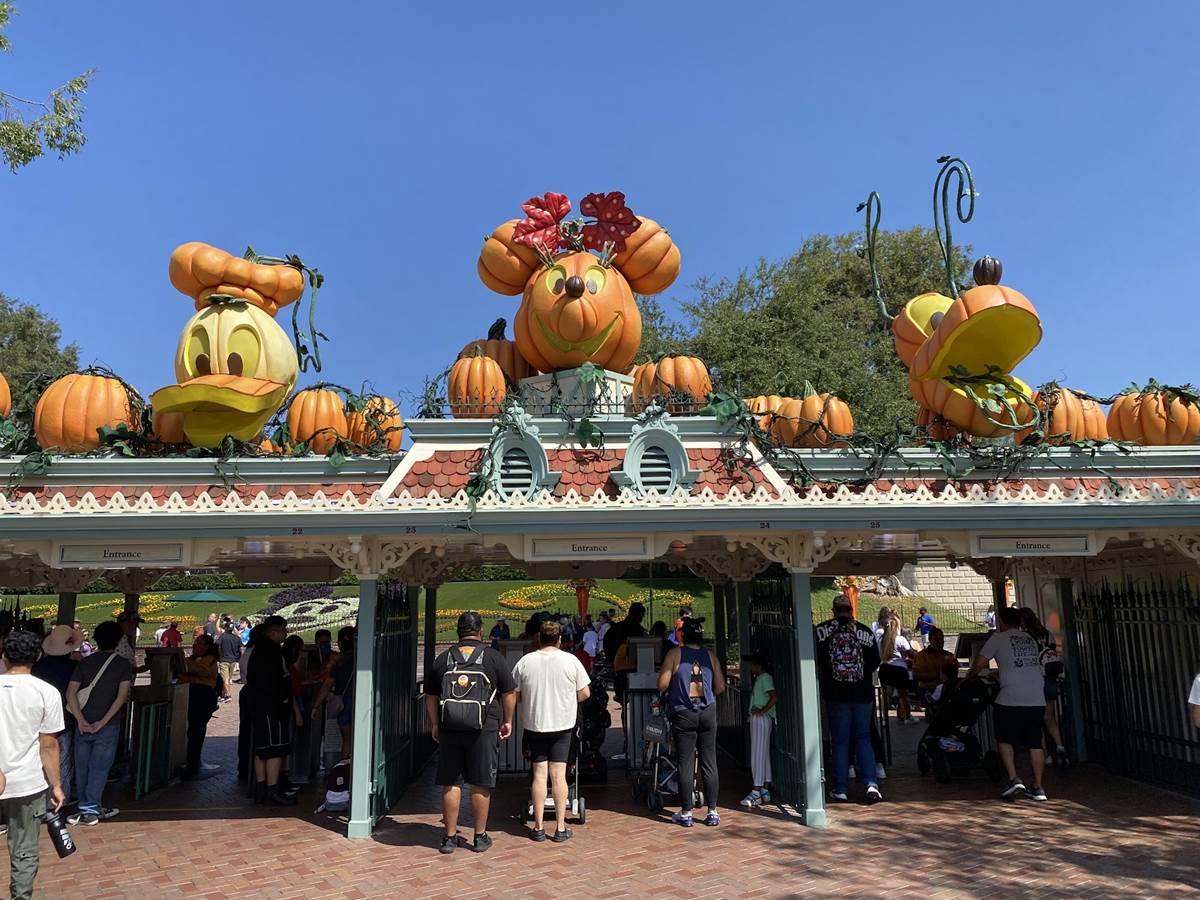 Across the Esplanade, Disneyland has decked out the park in the usual pumpkin decor, which starts at the turnstiles to the park.