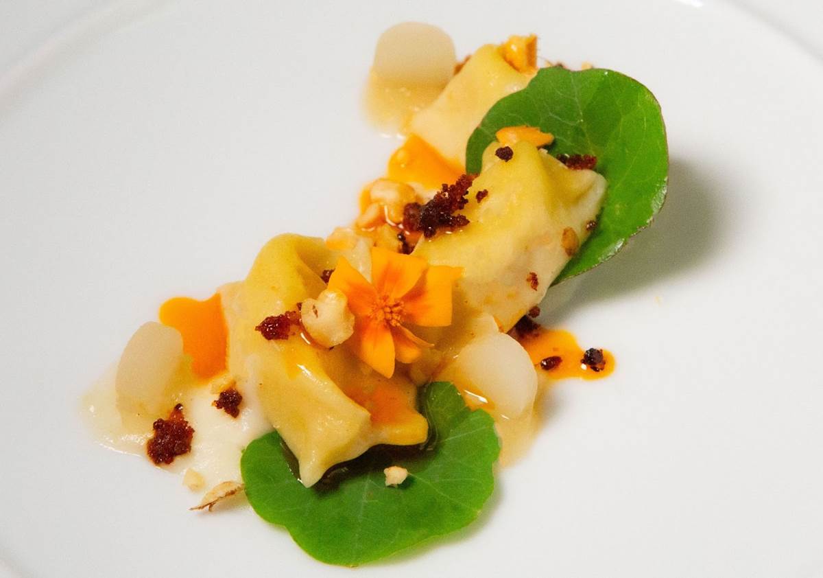 - Gorgonzola cheese filled agnolotti with spiced pear, walnuts, nasturtium and ‘Nduja vinaigrette from Il Mulino