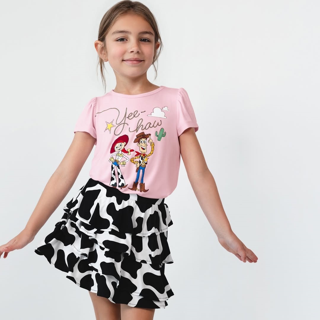- A pink print is also available on PJs, Skater Dresses & Flutter Crewneck Sweatshirts along with a cow print skirt for a cowgirl-inspired look inspired by Jessie.