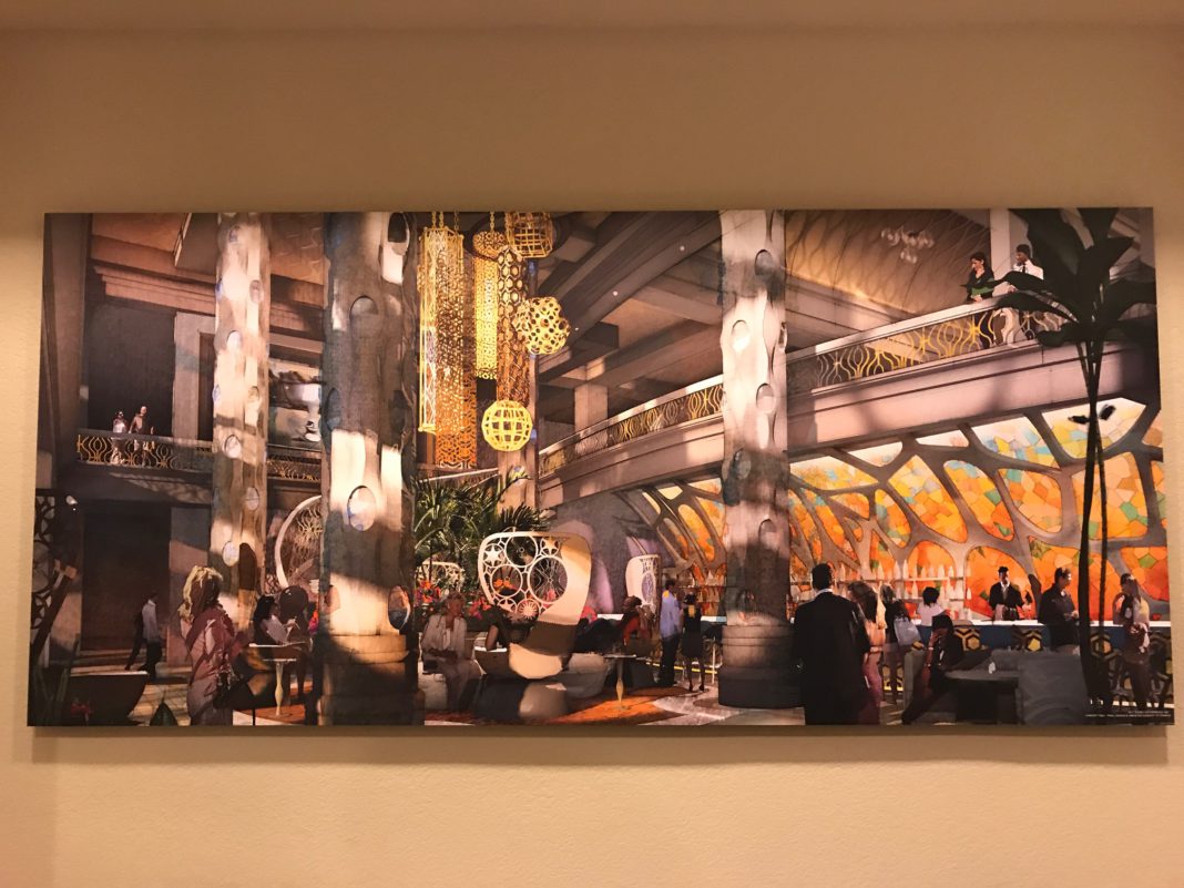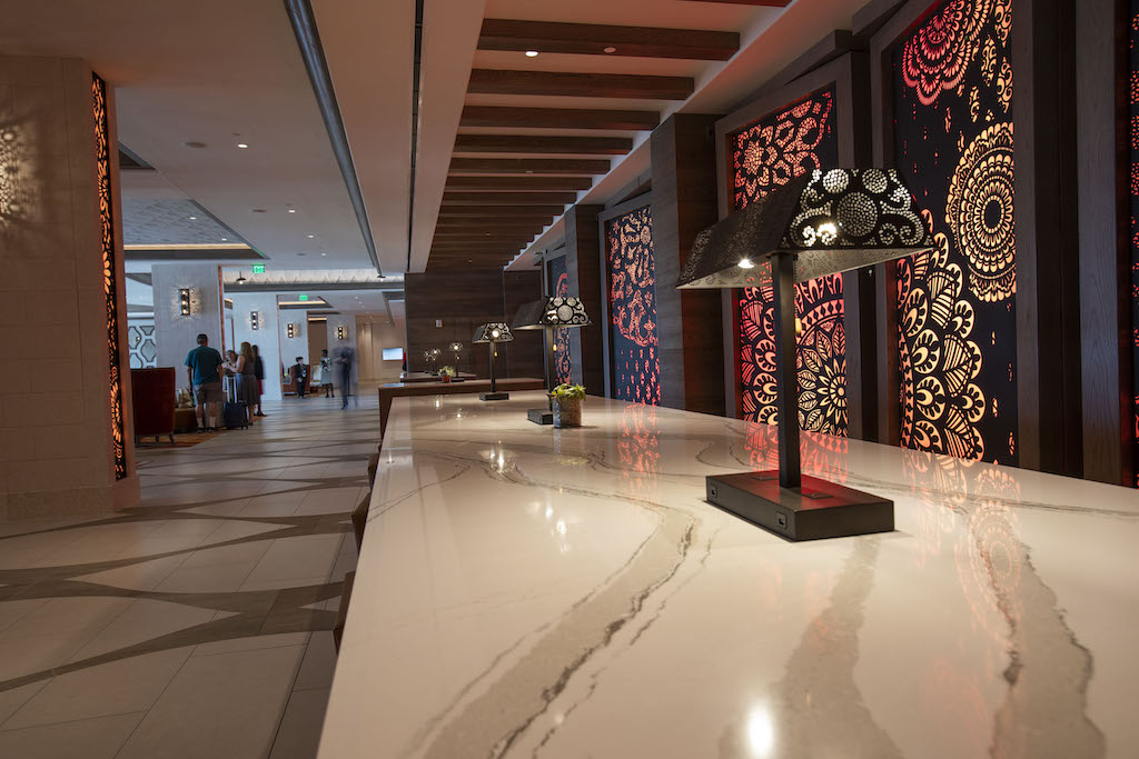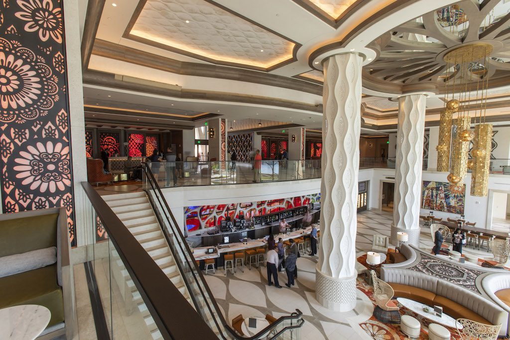 Guests at a preview of the new Gran Destino Tower at Disney’s Coronado Springs Resort are welcomed into a stunning two-level lobby. Gran Destino Tower opens July 9 at Walt Disney World Resort in Lake Buena Vista, Florida. (Steven Diaz, photographer)