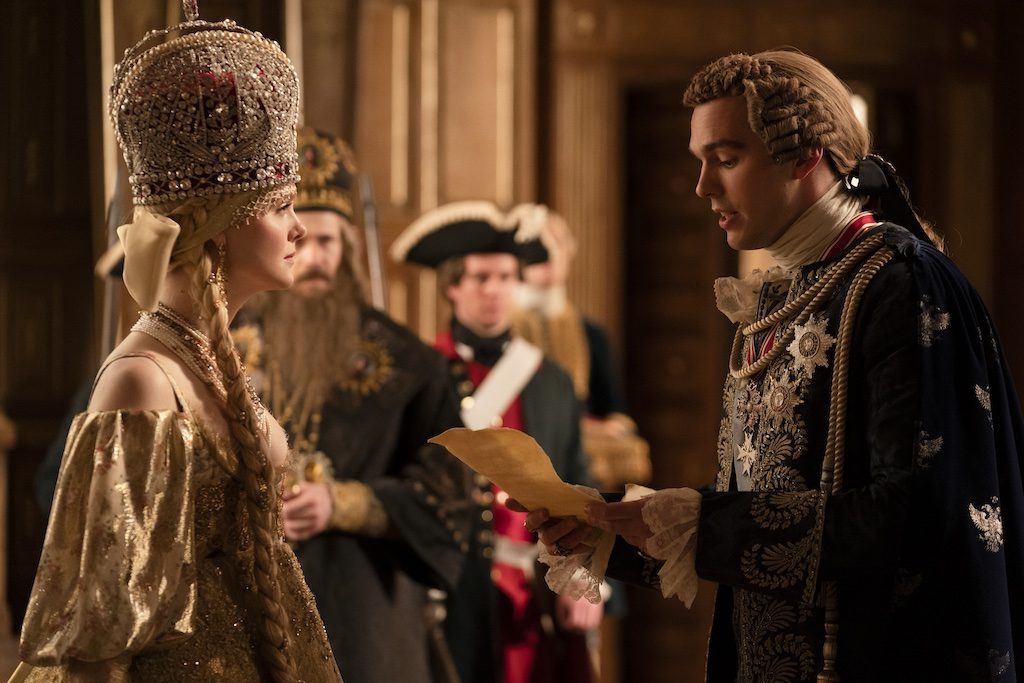 The Great -- Episode 201 -- In season two of “The Great,” Catherine finally takes the Russian throne for her own — but if she thought coup-ing her husband was difficult, it’s nothing compared to the realities of ‘liberating' a country that doesn’t want to be. Peter (Nicholas Hoult), Catherine (Elle Fanning), shown. (Photo by: Gareth Gatrell/Hulu)