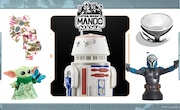 (L-R): The Mandalorian (Pedro Pascal), Grogu and Peli Motto (Amy Sedaris) in Lucasfilm's THE MANDALORIAN, season three, exclusively on Disney+. ©2022 Lucasfilm Ltd. & TM. All Rights Reserved.