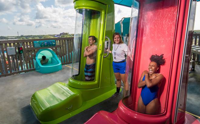 - Adventure Island Water Park, located across the street from Busch Gardens Tampa Bay, will also splash into fun with Castaway Falls. The all-new multi-level, interactive water-play attraction will feature more than 100 play elements, including two giant tipping buckets that dump more than 1,300 gallons of water combined, four exciting water slides, soakers, spray jets, water shooters, spinning and sliding buckets, and much more.