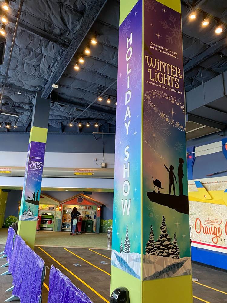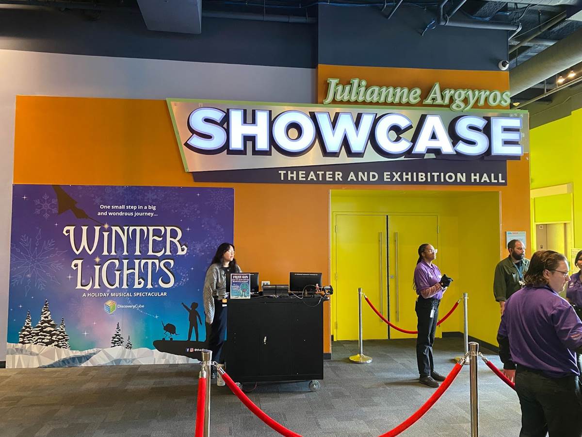 Below you can see photos of our approach to the Discovery Cube, the exterior of the building, the interior decor for the holiday season, and the area surrounding the Julianne Argyros Showcase theater. There’s also a small gift shop called “Aurora Storealis" where guests can pick up merchandise from the “Winter Lights" show and a cute little plush of Jean Luc.