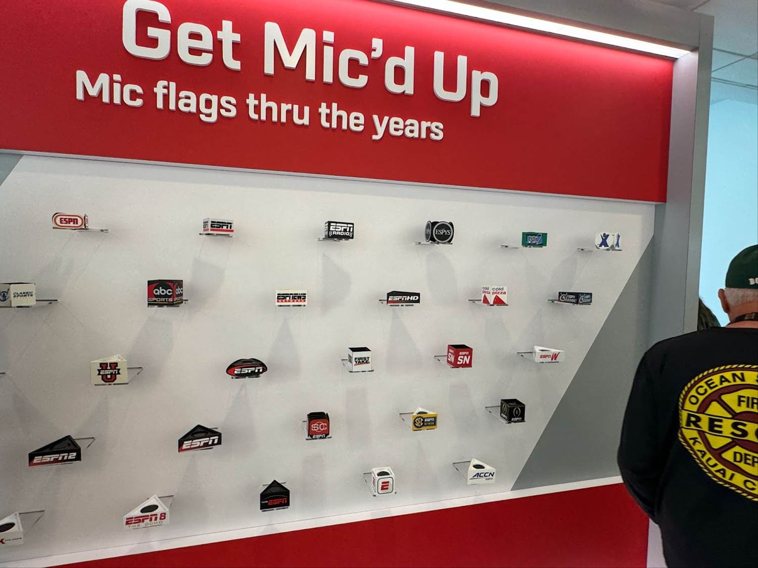 For the morning segment of the tour, we got to check-out a control booth, an audio booth, and various stages including the homes of SportsCenter, NFL Live, and Baseball Tonight, among others. We also got to see some parts of ESPN history including panels that were part of the original SportsCenter sets, mic flags through the years, and an eclectic collection of caps which also included a pair of mouse ears.