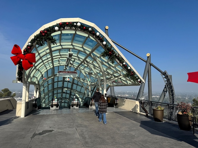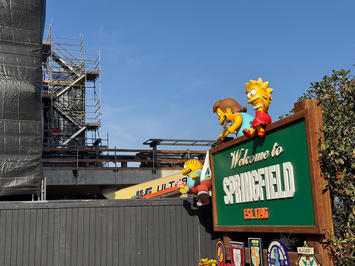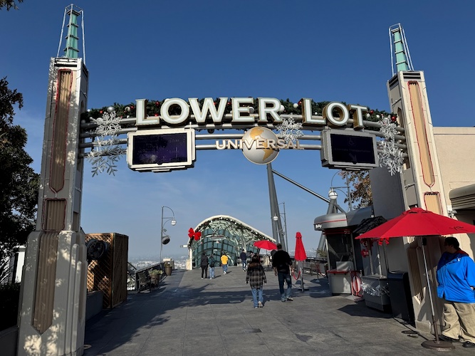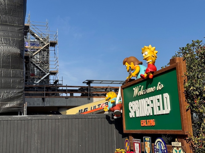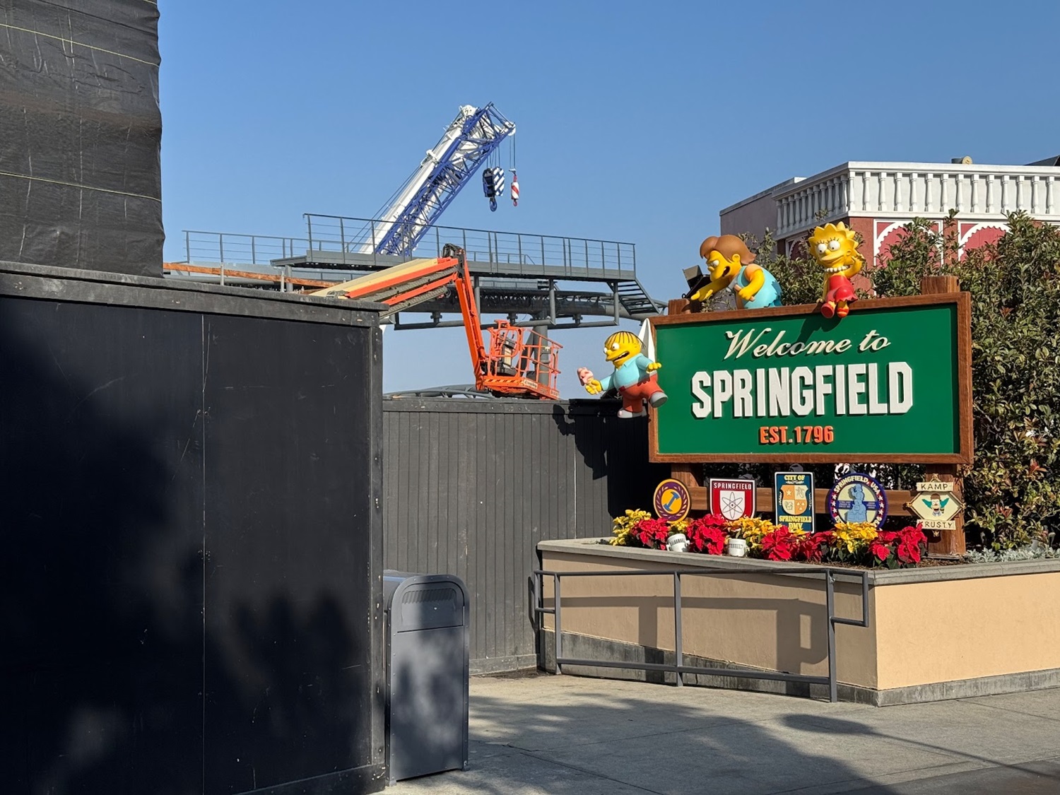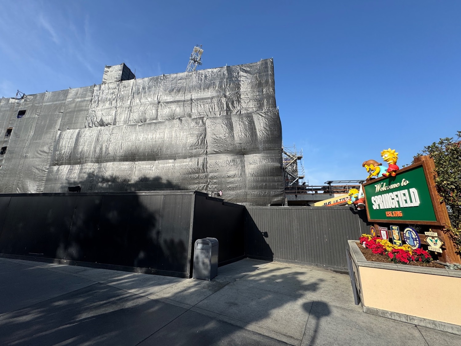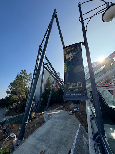 We begin just outside the entrance to The Wizarding World of Harry Potter, where the large station for the attraction rises behind construction tarps.